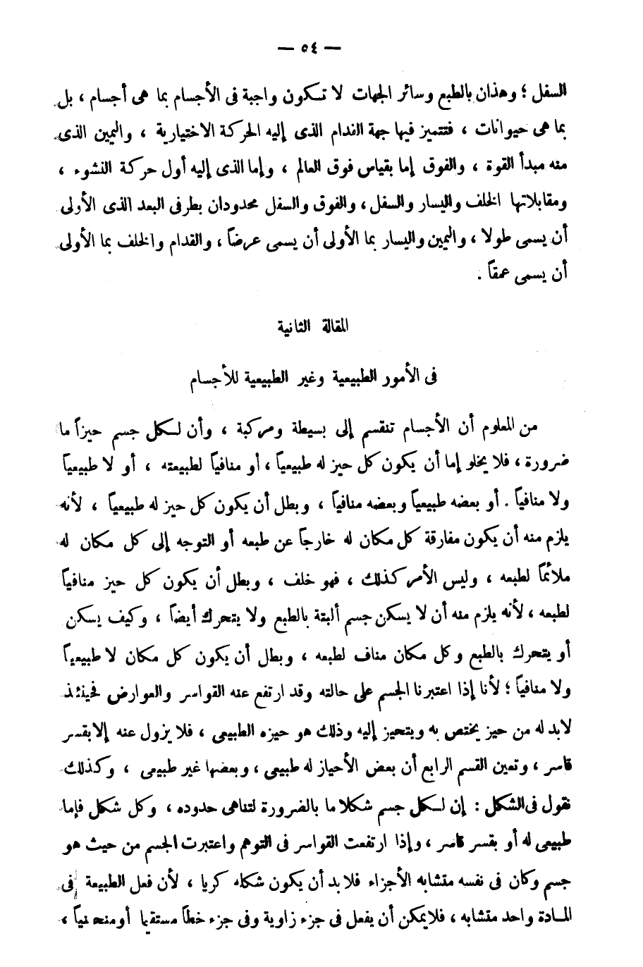من المعلوم أن الأجسام تنقسم إلى بسيطة ومركبة، وأن لكل جسم حيزا ما ضرورة، فلا يخلو إما أن يكون كل حيز له طبيعيا، أو منافيا لطبيعته، أو لا طبيعيا ولا منافيا، أو بعضه طبيعيا وبعضه منافيا. وبطل أن يكون كل حيز له طبيعيا، لأنه يلوم منه أن يكون مفارقة كل مكان له خارجا عن طبعه أو التوجه إلى كل مكان له ملائما لطبعه، وليس الأمر كذلك، فهو خلف. وبطل أن يكون كل حيز منافيا لطبعه، لأنه يلزم منه أن لا يسكن جسم ألبتة بالطبع ولا يتحرك أيضا، وكيف يسكن أو يتحرك بالطبع وكل مكان مناف لطبعه؟ وبطل أن يكون كل مكان لا طبيعيا ولا منافيا، لأنا إذا اعتبرنا الجسم على حالته وقد ارتفع عنه القواسر والعوارض فحينئذ لا بد له من حيز يختص به ويتحيز إليه وذلك هو حيزه الطبيعي، فلا يزول عنه إلا بقسر قاسر. وتعين القسم الرابع لأن بعض الأحياز له طبيعي، وبعضها غير طبيعي. وكذلك نقول في الشكل: إن لكل جسم شكلا ما بالضرورة لتناهي حدوده، وكل شكل فإما طبيعي له أو بقسر قاسر، وإذا ارتفعت القواسر في التوهم واعتبرت الجسم من حيث هو جسم وكان في نفسه متشابه الأجزاء فلا بد أن يكون شكله كريا، لأن فعل الطبيعة في المادة واحد متشابه، فلا يمكن أن يفعل في جزء زاوية وفي جزء خطا مستقيما أو منحنيا،
