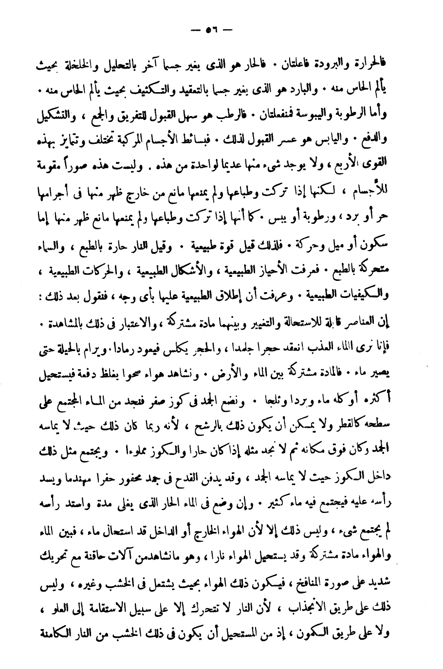 فالحرارة والبرودة فاعلتان، فالحار هو الذي يغير جسما آخر بالتحليل والخلخلة بحيث يألم الحاس منه، والبارد هو الذي يغير جسما بالتعقيد والتكثيف بحيث يألم الحاس منه. وأما الرطوبة واليبوسة فمنفعلتان، فالرطب هو سهل القبول للتفريق والجمع, والتشكيل والدفع، واليابس هو عسر القبول لذلك. فبسائط الأجسام المركبة تختلف وتتمايز بهذه القوى الأربع، ولا يوجد شيئا منها عديما لواحدة من هذه. وليست هذه صورا مقومة للأجسام، لكنها إذا تركت وطباعها ولم يمنعها مانع من خارج ظهر منها في أجرامها حر أو برد ورطوبة أو يبس، كما أنها إذا تركت وطباعها ولم يمنعها مانع ظهر منها إما سكون أو ميل وحركة، فلذلك قيل قوة طبيعية، وقيل النار حارة بالطبع، والسماء متحركة بالطبع. فعرفت الأحياز الطبيعية، والأشكال الطبيعية، والحركات الطبيعية، والكيفيات الطبيعية. وعرفت أن إطلاق الطبيعية عليها بأي وجه، فنقول بعد ذلك: إن العناصر قابلة للاستحالة والتغيير وبينها مادة مشتركة، والاعتبار في ذلك بالمشاهدة، فإنا نرى الماء العذب انعقد حجرا جلمدا والحجر يكلس فيعود رمادا، ويرام بالحيلة حتى يصير ماء، فالمادة مشتركة بين الماء والأرض. ونشاهد هواء صحوا يغلظ دفعة فيستحيل أكثره أو كله ماء وبردا وثلجا، ونضع الجمد في كوز صفر فنجد من الماء المجتمع على سطحه كالقطر ولا يمكن أن يكون ذلك بالرشح، لأنه ربما كان ذلك حيث لا يماسه الجمد وكان فوق مكانه ثم لا نجد مثله إذا كان حارا والكوز مملوءا، ويجتمع مثل ذلك داخل الكوز حيث لا يماسه الجمد، وقد يدفن القدح في جمد محفور حفرا مهندما ويسد رأسه عليه فيجتمع فيه ماء كثير، وإن وضع في الماء الحار الذي يغلي مدة واستد رأسه لم يجتمع شيء، وليس ذلك إلا لأن الهواء الخارج أو الداخل قد استحال ماء، فبين الماء والهواء مادة مشتركة. وقد يستحيل الهواء نارا، وهو ما نشاهد من آلات حاقنة مع تحريك شديد على صورة المنافخ، فيكون ذلك الهواء بحيث يشتعل في الخشب وغيره، وليس ذلك على طريق الانجذاب، لأن النار لا تتحرك إلا على سبيل الاستقامة إلى العلو، ولا على طريق الكمون، إذ من المستحيل أن يكون في ذلك الخشب من النار الكامنة