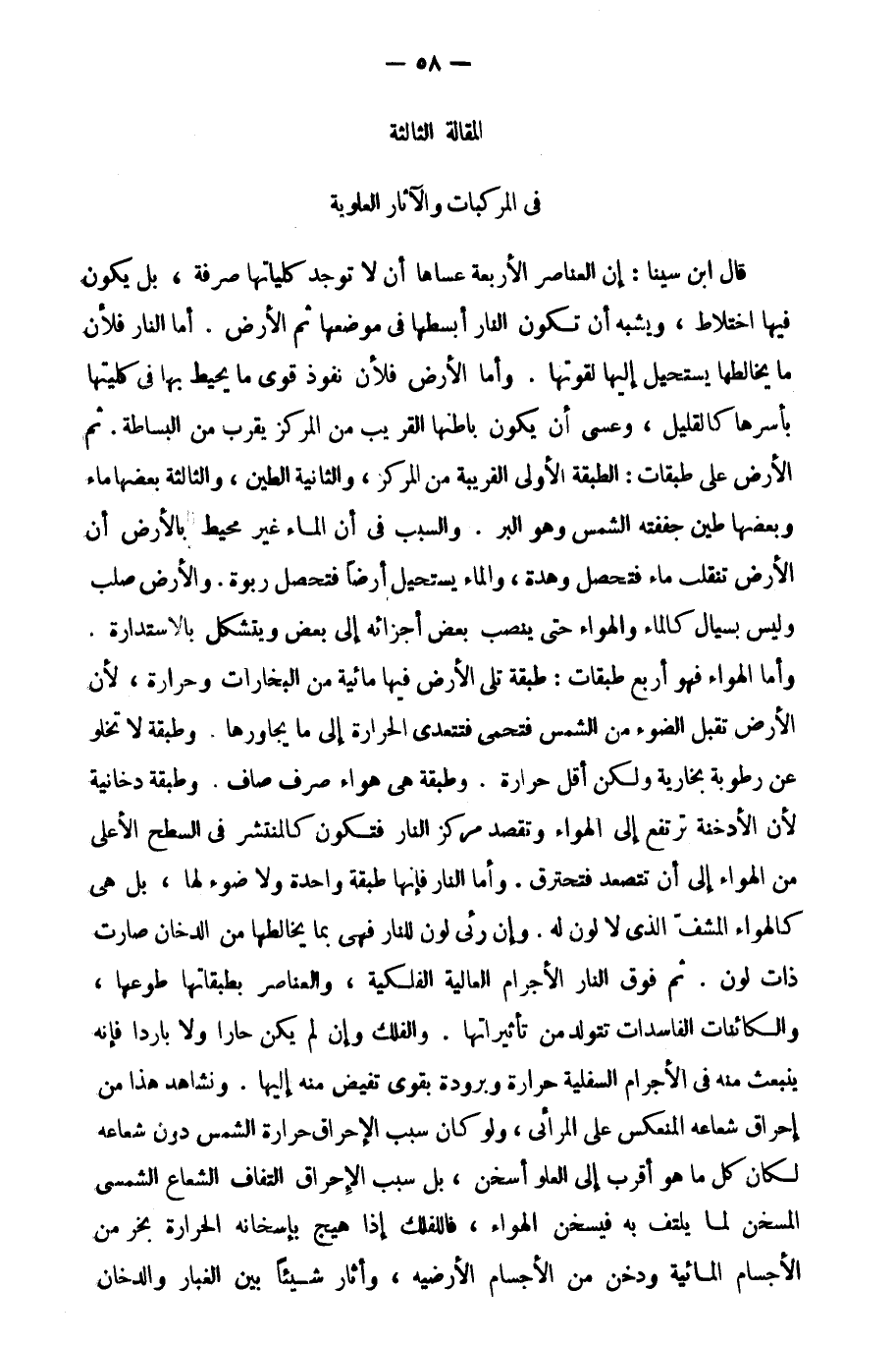 قال ابن سينا: إن العناصر الأربعة عساها أن لا توجد كلياتها صرفة, بل يكون فيها اختلاط، ويشبه أن تكون النار أبسطها في موضعها ثم الأرض، أما النار فلأن ما يخالطها يستحيل إليها لقوتها، وأما الأرض فلأن نفوذ قوى ما يحيط بها في كليتها بأسرها كالقليل، وعسى أن يكون باطنها القريب من المركز يقرب من البساطة، ثم الأرض على طبقات: الطبقة الأولى القريبة من المركز، والثانة الطين، والثالثة بعضها ماء وبعضها طين جففته الشمس وهو البر. والسبب في أن الماء غير محيط بالأرض أن الأرض تنقلب ماء فتحصل وهدة, والماء يستحيل أرضا فتحصل ربوة، والأرض صلب وليس بسيال كالماء والهواء حتى ينصب بعض أجزائه إلى بعض ويتشكل بالاستدارة. وأما الهواء فهو أربع طبقات طبقة تلي الأرض فيها مائية من البخارات وحرارة لأن الأرض تقبل الضوء من الشمس فتحمي فتتعدى الحرارة إلى ما يجامرها، وطبقة لا تخلو عن رطوبة بخارية ولكن أقل حرارة، وطبقة هي هواء صرف صاف، وطبقة دخانية لأن الأدخنة ترتفع إلى الهواء وتقصد مركز النار فتكون كالمنتشر في السطح الأعلى من الهواء إلى أن تتصعد فتحترق. وأما النار فإنها طبقة واحدة ولا ضوء لها, بل هي كالهواء المشف الذي لا لون له، وإن رئي لون للنار فهي بما يخالطها من الدخان صارت ذات لون. ثم فوق النار الأجرام العالية الفلكية، والعناصر بطبقاتها طوعها، والكائنات الفاسدات تتولد من تأثيراتها. والفلك وإن لم يكن حارا ولا باردا فإنه ينبعث منه في الأجرام السفلية حرارة وبرودة بقوى تفيض منه إليها، ونشاهد هذا من إحراق شعاعه المنعكس على المرائي، ولو كان سبب الإحراق حرارة الشمس دون شعاعه لكان كل ما هو أقرب إلى العلو أسخن، بل سبب الإحراق التفاف الشعاع الشمسي المسخن لما يلتف به فيسخن الهواء، فالفلك إذا هيج بإسخانه الحرارة بخر من الأجسام المائية ودخن من الأجسام المائية ودخن من الأجسام الأرضية. وأثار شيئا بين الغبار والدخان