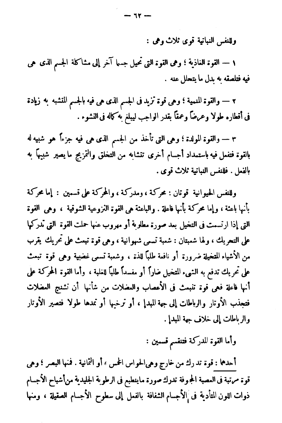 3- والقوة المولدة؛ وهي التي تأخذ من الجسم الذي هي فيه جزءا هو شبيه له بالقوة فتفعل فيه باستمداد أجسام أخرى تتشابه به من التخلق والتمزيج ما يصير شبيها به بالفعل. فللنفس النباتية ثلاث قوى.
