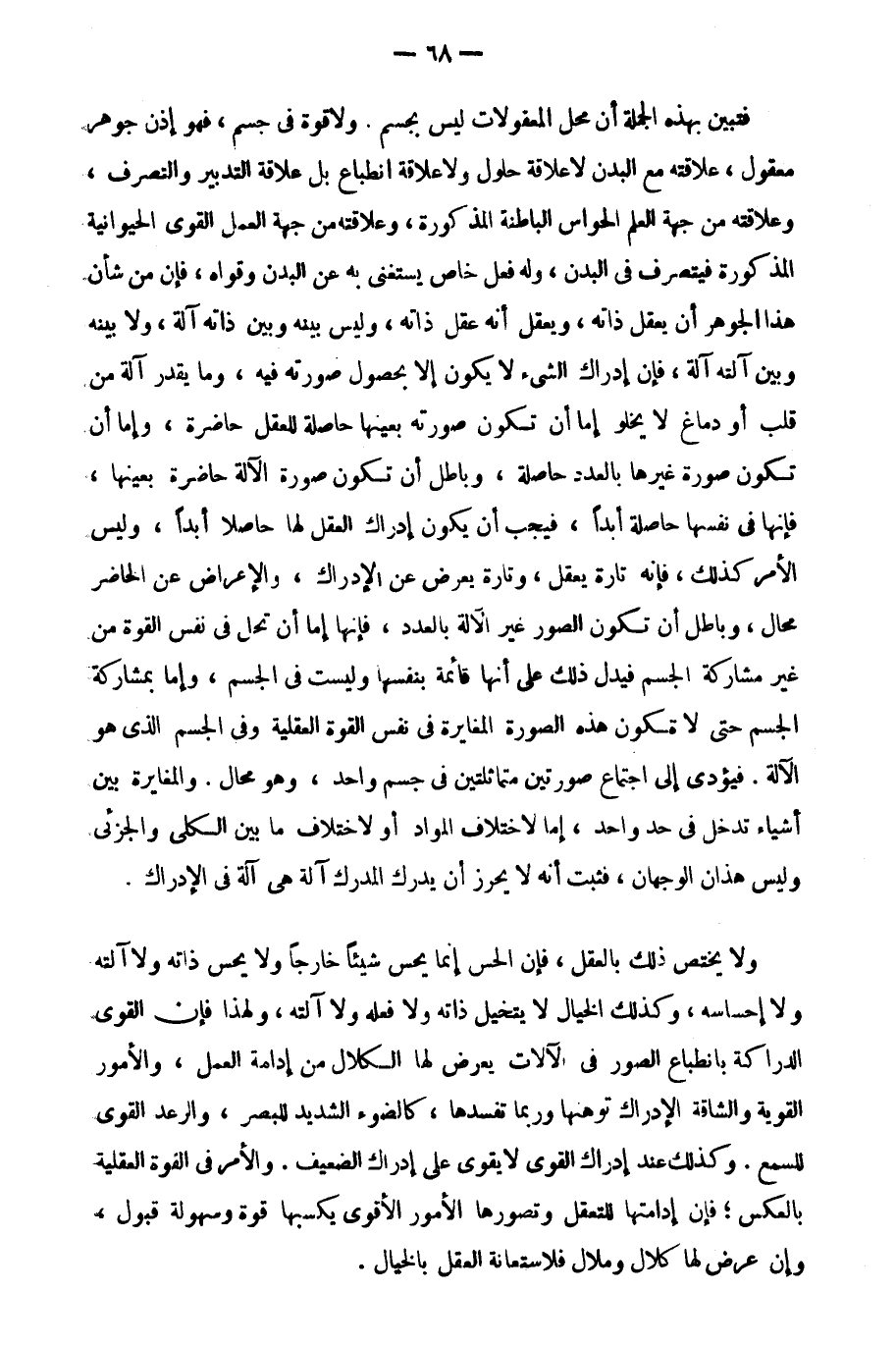 فتبين بهذه الجملة أن محل المعقولات ليس بجسم، ولا قوة في جسم، فهو إذن جوهر معقول، علاقته مع البدن لا علاقة حلول ولا علاقة انطباع بل علاقة التدبير والتصرف، وعلاقته من جهة العلم الحواس الباطنة المذكورة، وعلاقته من جهة العمل القوى الحيوانية المذكورة، فيتصرف في البدن, وله فعل خاص يستغني به عن البدن وقواه، فإن من شأن هذا الجوهر أن يعقل ذاته، ويعقل أنه عقل ذاته، وليس بينه وبين ذاته آلة، ولا بينه وبين آلته آلة، فإن إدراك الشيء لا يكون إلا بحصول صورته فيه, وما يقدر آلة من قلب أو دماغ لا يخل إما أن تكون صورته بعينها حاصلة للعقل حاضرة، وإما أن تكون صورة غيرها بالعدد حاصلة، وباطل أن تكون صورة الآلة حاضرة بعينها، فإنها في نفسها حاصلة أبدا، فيجب أن يكون إدراك العقل لها حاصلا أبدا، وليس الأمر كذلك، فإنه تارة يعقل, وتارة يعرض عن الإدراك، والأعراض عن الحاضر محال. وباطل أن تكون الصور غير الآلة بالعدد، فإنها إما أن تحل في نفس القوة من غير مشاركة الجسم فيدل ذلك على أنها قائمة بنفسها وليست في الجسم، وإما بمشاركة الجسم حتى لا تكون هذه الصورة المغايرة في نفس القوة العقلية وفي الجسم الذي هو الآلة، فيؤدي إلى اجتماع صورتين متماثلتين في جسم واحد، وهو محال. والمغايرة بين أشياء تدخل في حد واحد إما لاختلاف المواد أو لاختلاف ما بين الكلي والجزئي وليس هذان الوجهان، فثبت أنه لا يحرز أن يدرك المدرك آلة هي آلته في الإدراك.