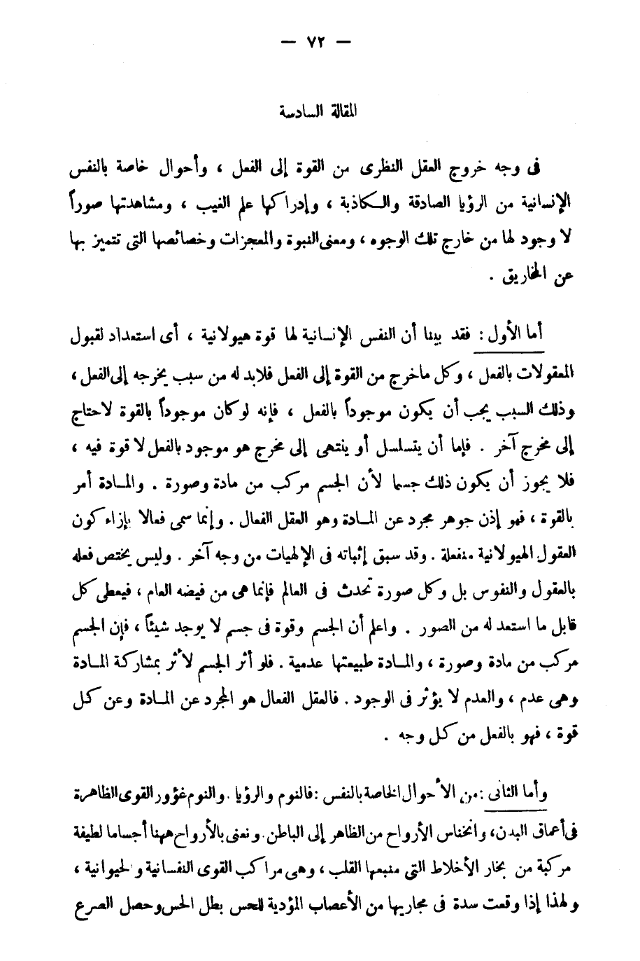 في وجه خروج العقل النظري من القوة إلى الفعل, وأحوال خاصة بالنفس الإنسانية من الرؤيا الصادقة والكاذبة، وإدراكها علم الغيب، ومشاهدتها صورا لا وجود لها من خارج تلك الوجوه، ومعنى النبوة والمعجزات وخصائصها التي تتميز بها عن المخاريق.