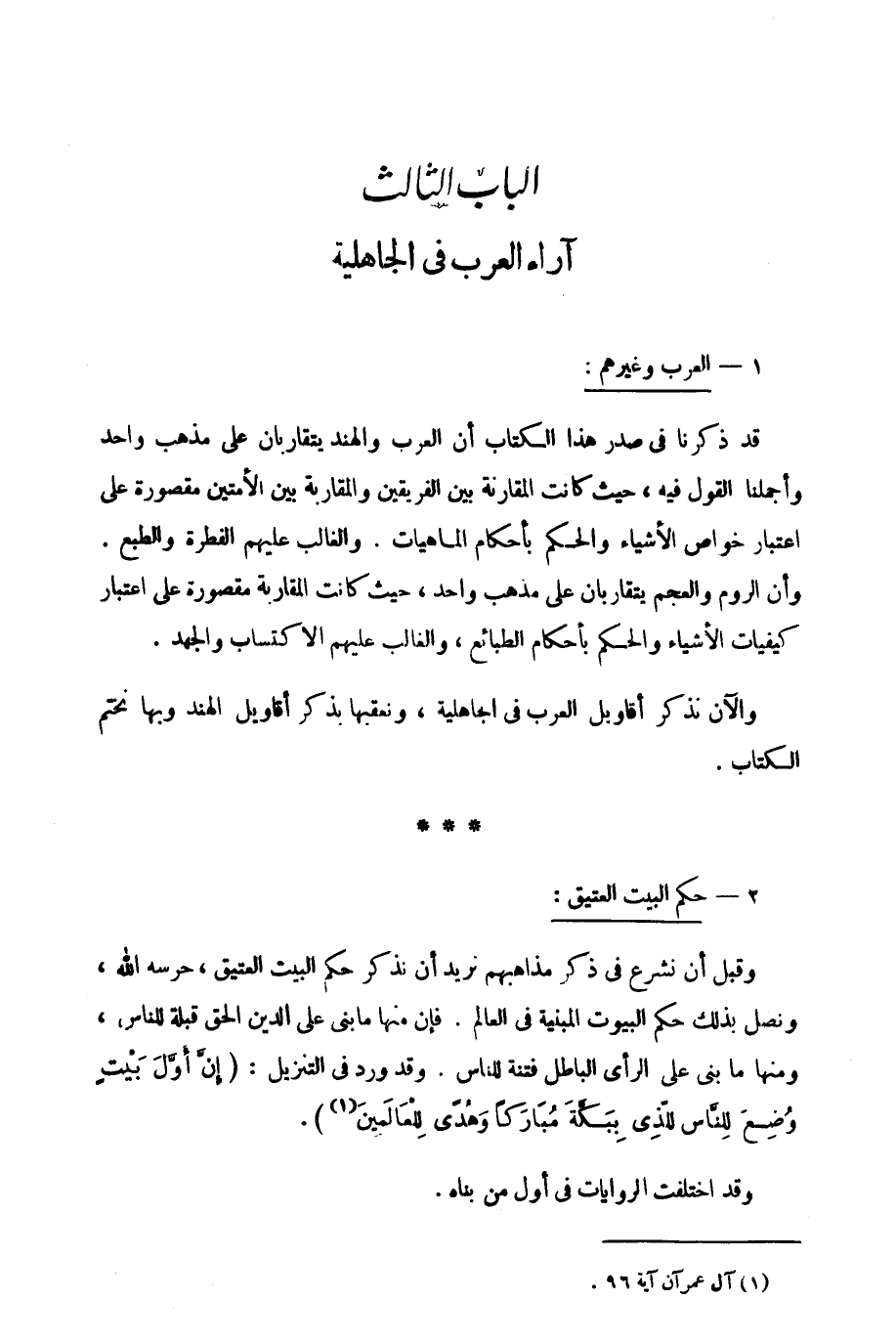 وقبل أن نشرع في ذكر مذاهبهم نريد أن نذكر حكم البيت العتيق، حرسه الله تعالى، ونصل بذلك حكم البوت المبنية في العالم, فإن منها ما بني على الدين الحق قبلة للناس، ومنها ما بني على الرأي الباطل فتنة للناس. وقد ورد في التنزيل: {إِنَّ أَوَّلَ بَيْتٍ وُضِعَ لِلنَّاسِ لَلَّذِي بِبَكَّةَ مُبَارَكًا وَهُدىً لِلْعَالَمِينَ} 1.