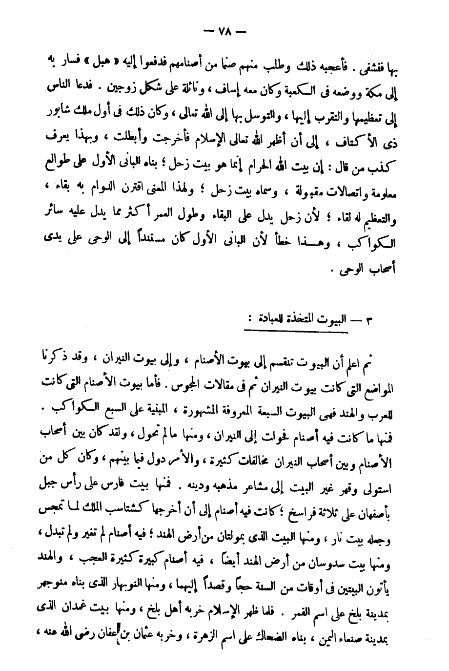 ثم اعلم أن البيوت تنقسم إلى بيوت الأصنام، وإلى بيوت النيران. وقد ذكرنا المواضع التي كانت بيوت النيران ثم في مقالات المجوس. فأما بيوت الأصنام التي كانت للعرب والهند فهي البيوت السبعة المعروفة المشهورة، المبنية على السبع الكواكب. فمنها ما كانت فيه أصنام فحولت إلى النيران، ومنها ما لم تحول. ولقد كان بين أصحاب الأصنام وبين أصحاب النيران مخالفات كثيرة، والأمر دول فيما بينهم، وكان كل من استولى وقهر غير البيت إلى مشاعر مذهبه ودينه. فمنها بيت فارس على رأس جبل بأصفهان على ثلاثة فراسخ, كانت فيه أصنام إلى أن أخرجها كشتاسب الملك لما تمجس وجعله بيت نار ومنها البيت الذي بمولتان من أرض الهند، فيه أصنام لم تغير ولم تبدل. ومنها بيت سدوسان من أرض الهند أيضا، فيه أصنام كبيرة كثيرة العجب، والهند يأتون البيتين في أوقات من السنة حجا وقصدا إليهما. ومنه النوبهار الذي بناه منوجهر بمدينة بلخ على اسم القمر، فلما ظهر الإسلام خربه أهل بلخ. ومنها بيت غمدان الذي بمدينة صنعاء اليمن بناه الضحاك على اسم الزهرة, وخربه عثمان بن عفان رضي الله عنه،