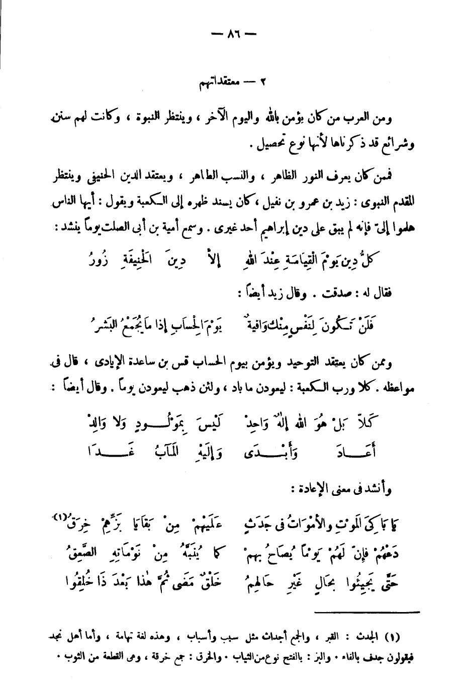 وممن كان يعتقد التوحيد ويؤمن بيوم الحساب قس بن ساعدة الإيادي, قال في مواعظه, كلا ورب الكعبة:! ليعودون ما باد، ولئن ذهب ليعودن يوما. وقال أيضا: