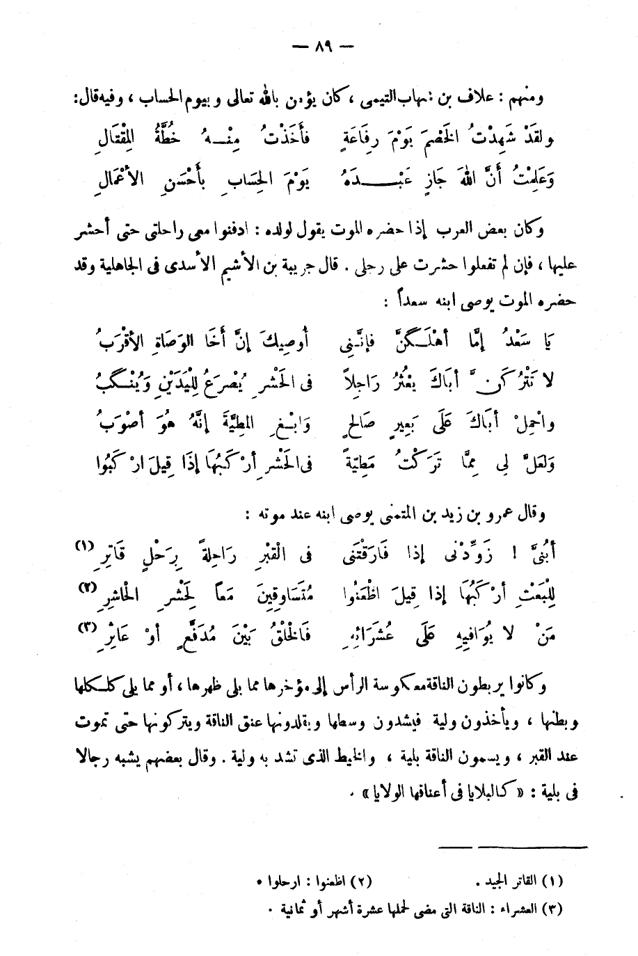 وكان بعض العرب إذا حضره الموت يقول لولده: ادفنوا معي راحلتي حتى أحشر عليها، فإن لم تفعلوا حشرت على رجلي قال جريبة بن الأشيم الأسدي في الجاهلية وقد حضره الموت، يوصي ابنه سعدا: