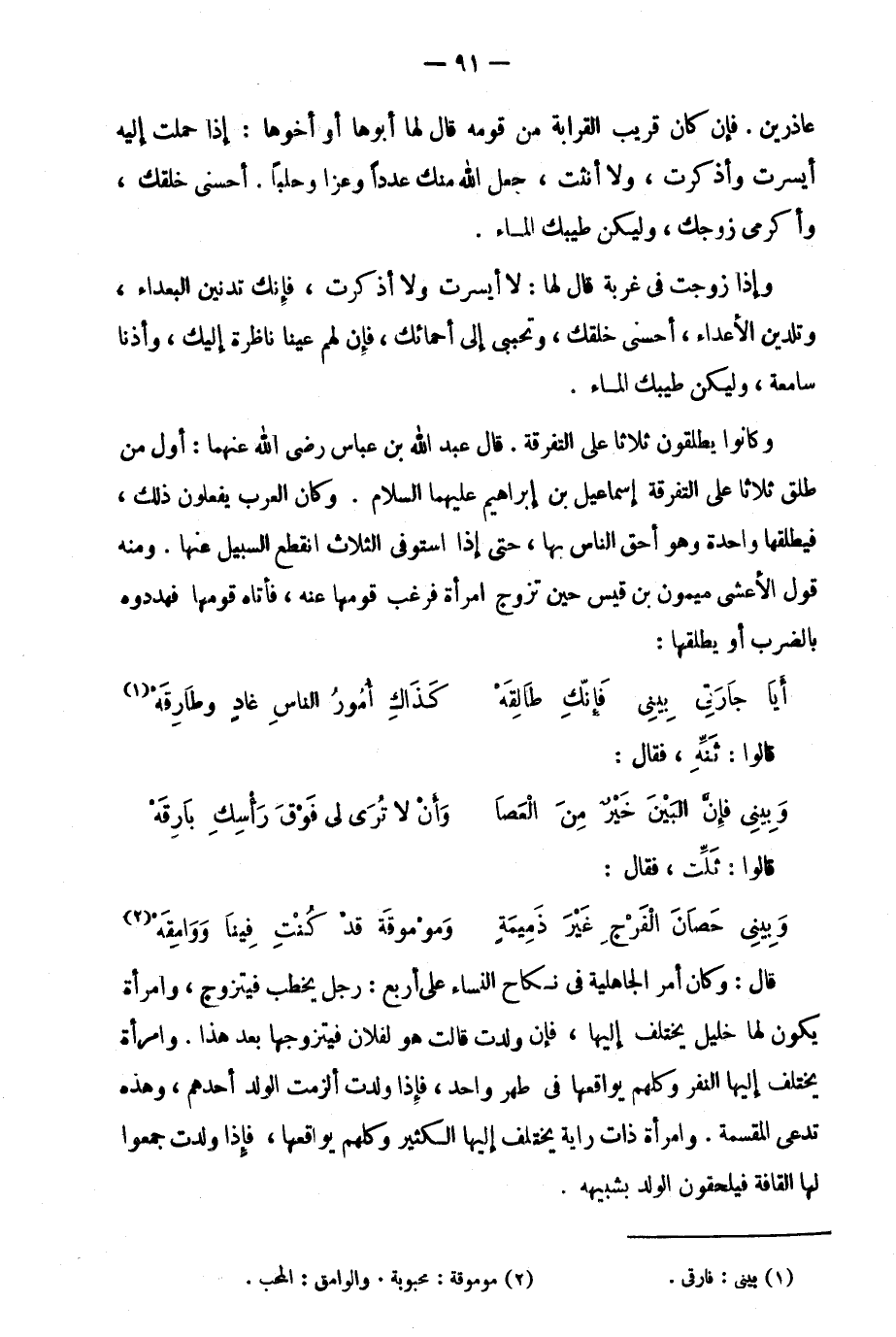 وكانوا يطلقون ثلاثا على التفرقة، قال عبد الله بن عباس رضي الله عنهما: أول من طلق ثلاثا على التفرقة إسماعيل بن إبراهيم عليهما السلام. وكان العرب يفعلون ذلك، فيطلقها واحدة وهو أحق الناس بها، حتى إذا استوفى الثلاث انقطع السبيل عنها، ومنه قول الأعشى ميمون بن قيس حين تزوج امرأة فرغب قومها عنه، فآتاه قومها، فهددوه بالضرب أو يطلقها: