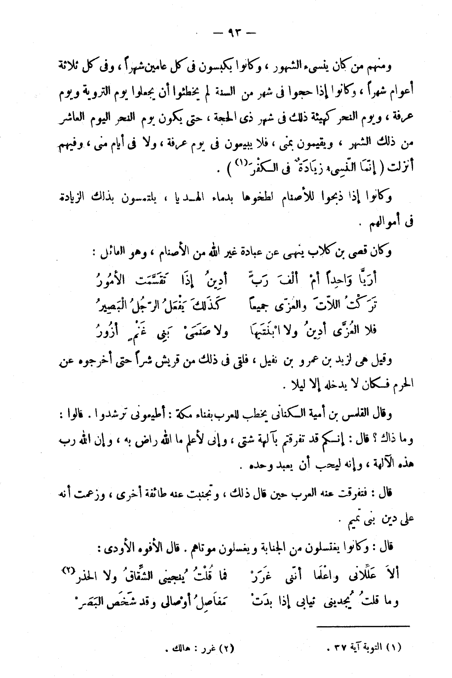 ومنهم من كان ينسىء الشهور، وكانوا يكبسون في كل عامين شهرا، وفي كل ثلاثة أعوام شهرا، وكانوا إذا حجوا في شهر من السنة لم يخطئوا أن يجعلوا يوم التروية، ويوم عرفة، ويوم النحر، كهيئة ذلك في شهر ذي الحجة، حتى يكون يوم النحر اليوم العاشر من ذلك الشهر، ويقيمون بمني، فلا يبيعون في يوم عرفة، ولا في أيام منى، وفيهم أنزلت: {إِنَّمَا النَّسِيءُ زِيَادَةٌ فِي الْكُفْرِ} 1.