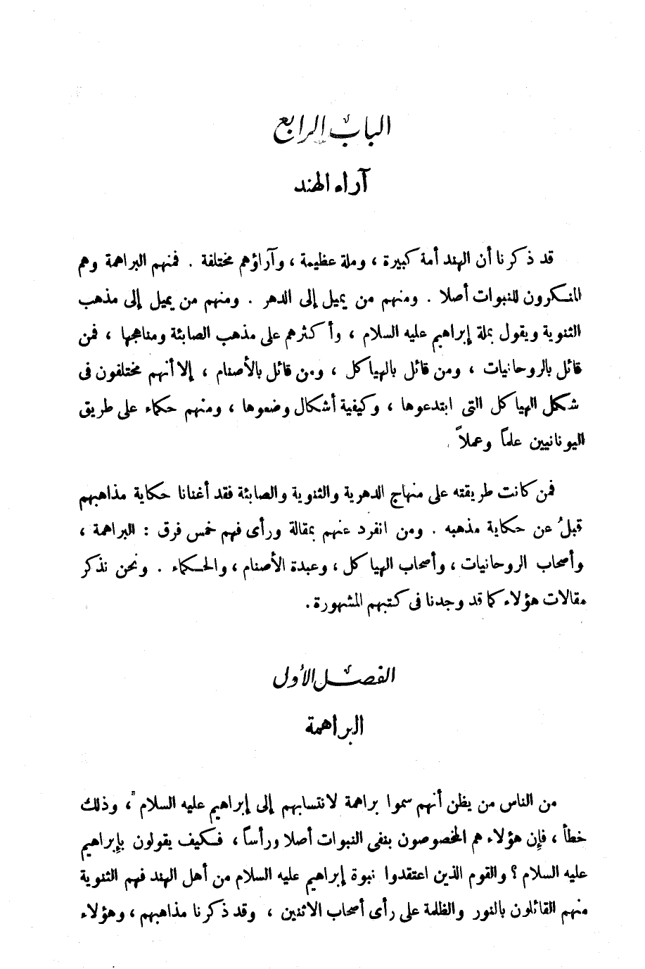فمن كانت طريقته على منهاج الدهرية والثنوية والصابئة فقد أغنانا حكاية مذاهبهم قبل عن حكاية مذهبه، ومن انفرد عنهم بمقالة ورأي فهم خمس فرق: البراهمة، وأصحاب الروحانيات، وأصحاب الهياكل، وعبدة الأصنام، والحكماء. ونحن نذكر مقالات هؤلاء كما قد وجدنا في كتبهم المشهورة.