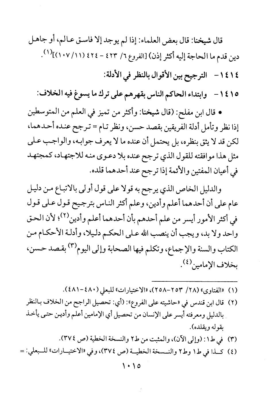 (¬2) قال ابن قندس في "حاشيته على الفروع": (أي: تحصيل الراجح من الخلاف بالنظر بالدليل ومعرفته أيسر على الإنسان من تحصيل أي الإمامين أعلم وأدين حتى يأخذ بقوله ويقلده).