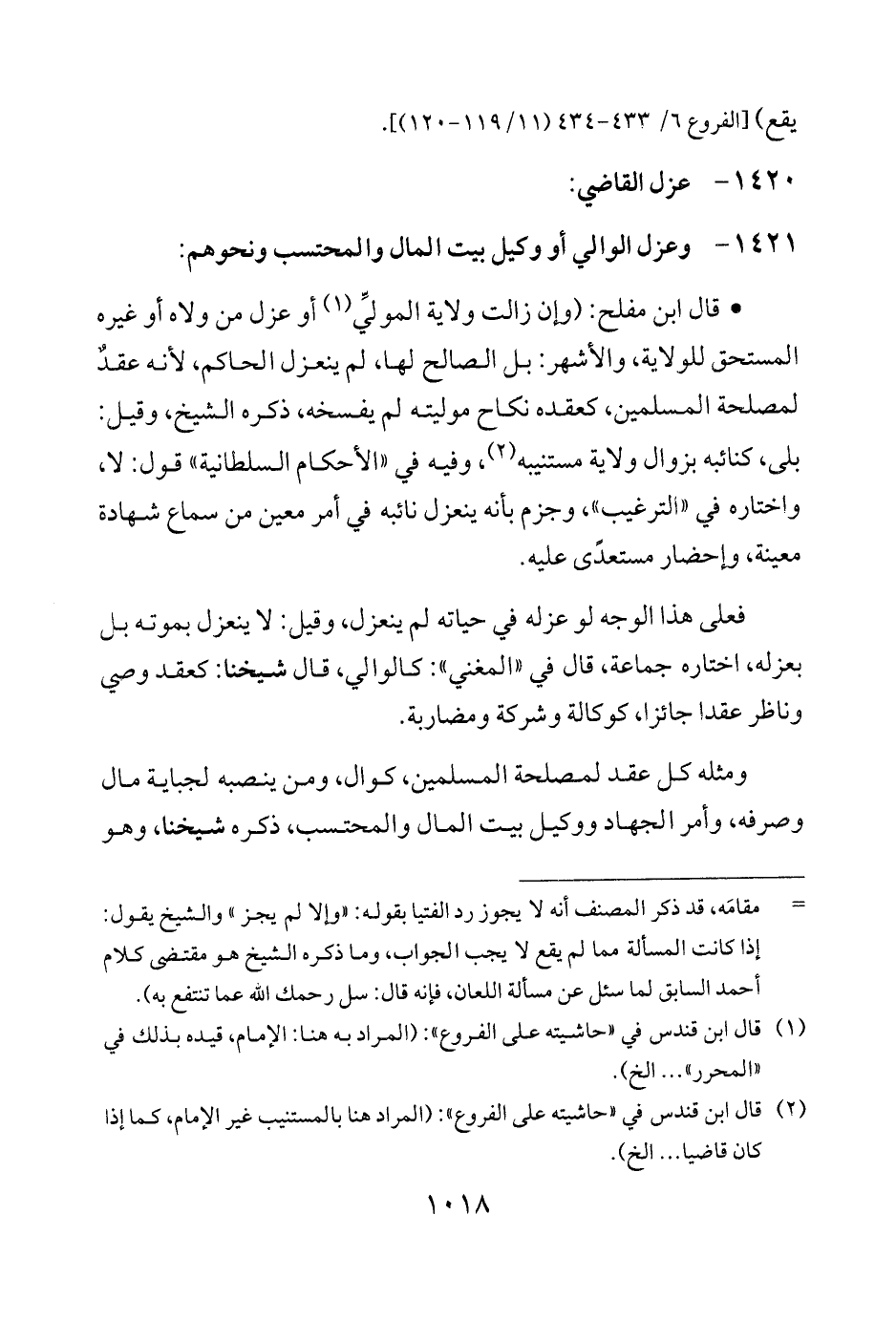 1421 - وعزل الوالي أو وكيل بيت المال والمحتسب ونحوهم: