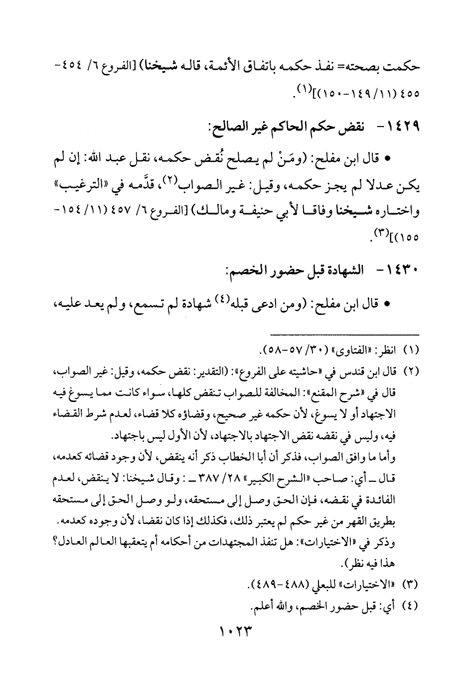 وأما ما وافق الصواب، فذكر أن أبا الخطاب ذكر أنه ينقض، لأن وجود قضائه كعدمه، قال -أي: صاحب "الشرح الكبير" 28/ 387 - : وقال شيخنا: لا ينقض، لعدم الفائدة في نقضه، فإن الحق وصل إلى مستحقه، ولو وصل الحق إلى مستحقه بطريق القهر من غير حكم لم يعتبر ذلك، فكذلك إذا كان نقضا، لأن وجوده كعدمه. وذكر في في "الاختيارات": هل تنفذ المجتهدات من أحكامه أم يتعقبها العالم العادل؟ هذا فيه نظر).