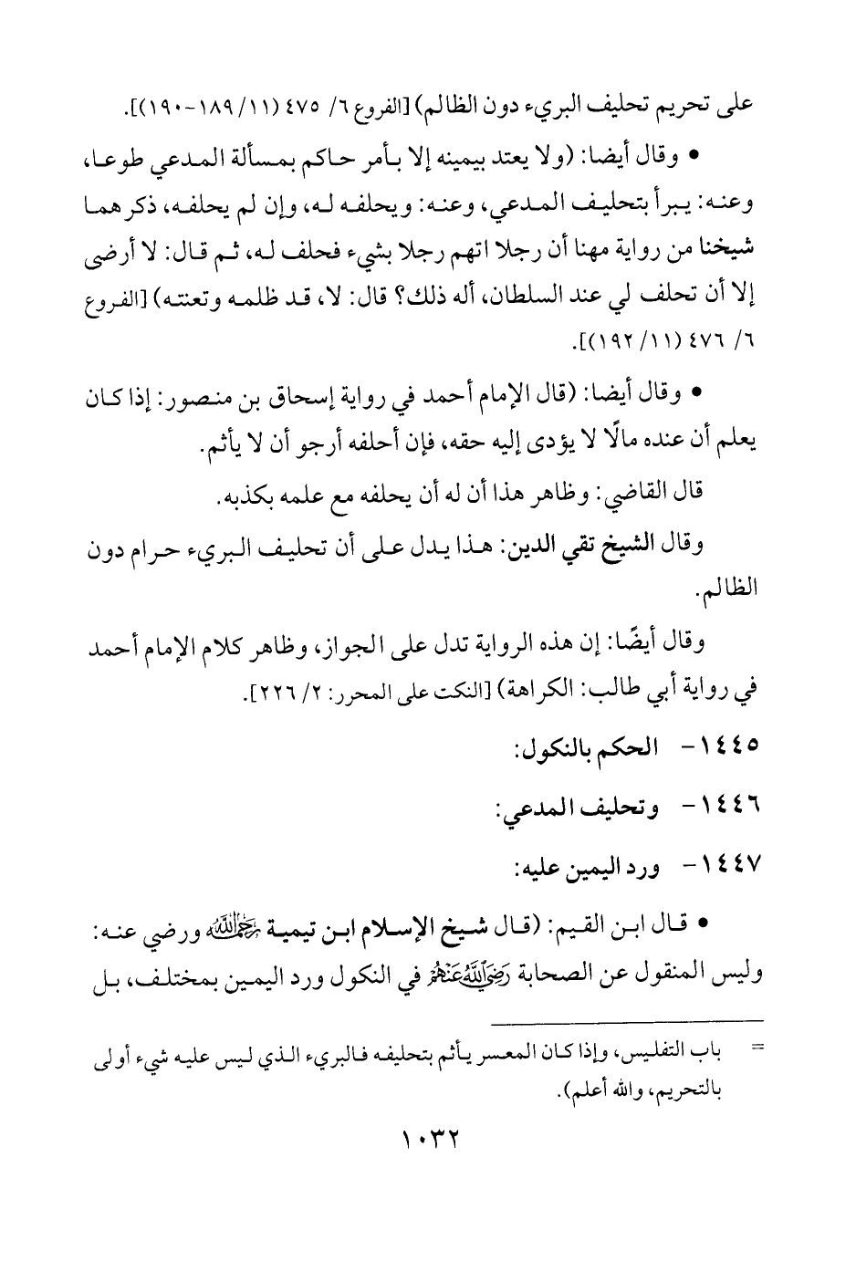 على تحريم تحليف البريء دون الظالم) [الفروع 6/ 475 (11/ 189 - 190)].
