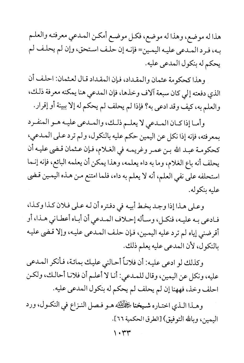 وهذا الذي اختاره شيخنا رحمه الله هو فصل النزاع في النكول، ورد اليمين، وبالله التوفيق) [الطرق الحكمية 66].