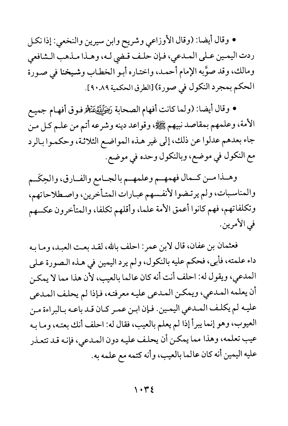 • وقال أيضًا: (ولما كانت أفهام الصحابة - رضي الله عنهم - فوق أفهام جميع الأمة، وعلمهم بمقاصد نبيهم - صلى الله عليه وسلم -، وقواعد دينه وشرعه أتم من علم كل من جاء بعدهم عدلوا عن ذلك، إلى غير هذه المواضع الثلاثة، وحكموا بالرد مع النكول في موضع، وبالنكول وحده في موضع.