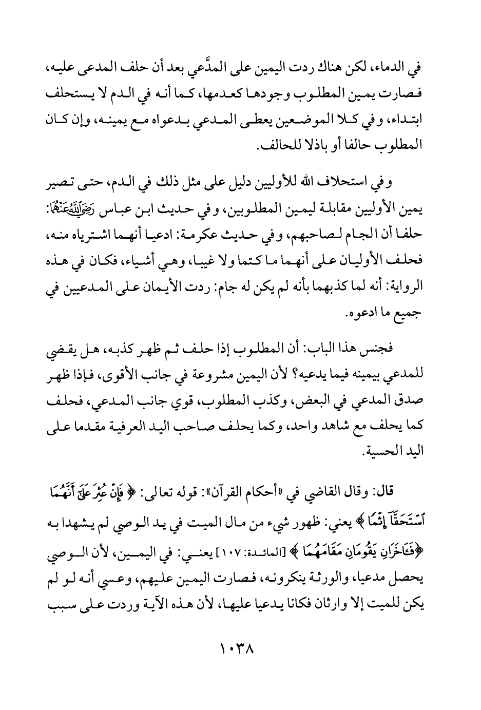 وفي استحلاف الله للأوليين دليل على مثل ذلك في الدم، حتى تصير يمين الأوليين مقابلة ليمين المطلوبين، وفي حديث ابن عباس - رضي الله عنهما -: حلفا أن الجام لصاحبهم، وفي حديث عكرمة: ادعيا أنهما اشترياه منه، فحلف الأوليان على أنهما ما كتما ولا غيبا، وهي أشياء، فكان في هذه الرواية: أنه لما كذبهما بأنه لم يكن له جام: ردت الإيمان على المدعيين في جميع ما ادعوه.