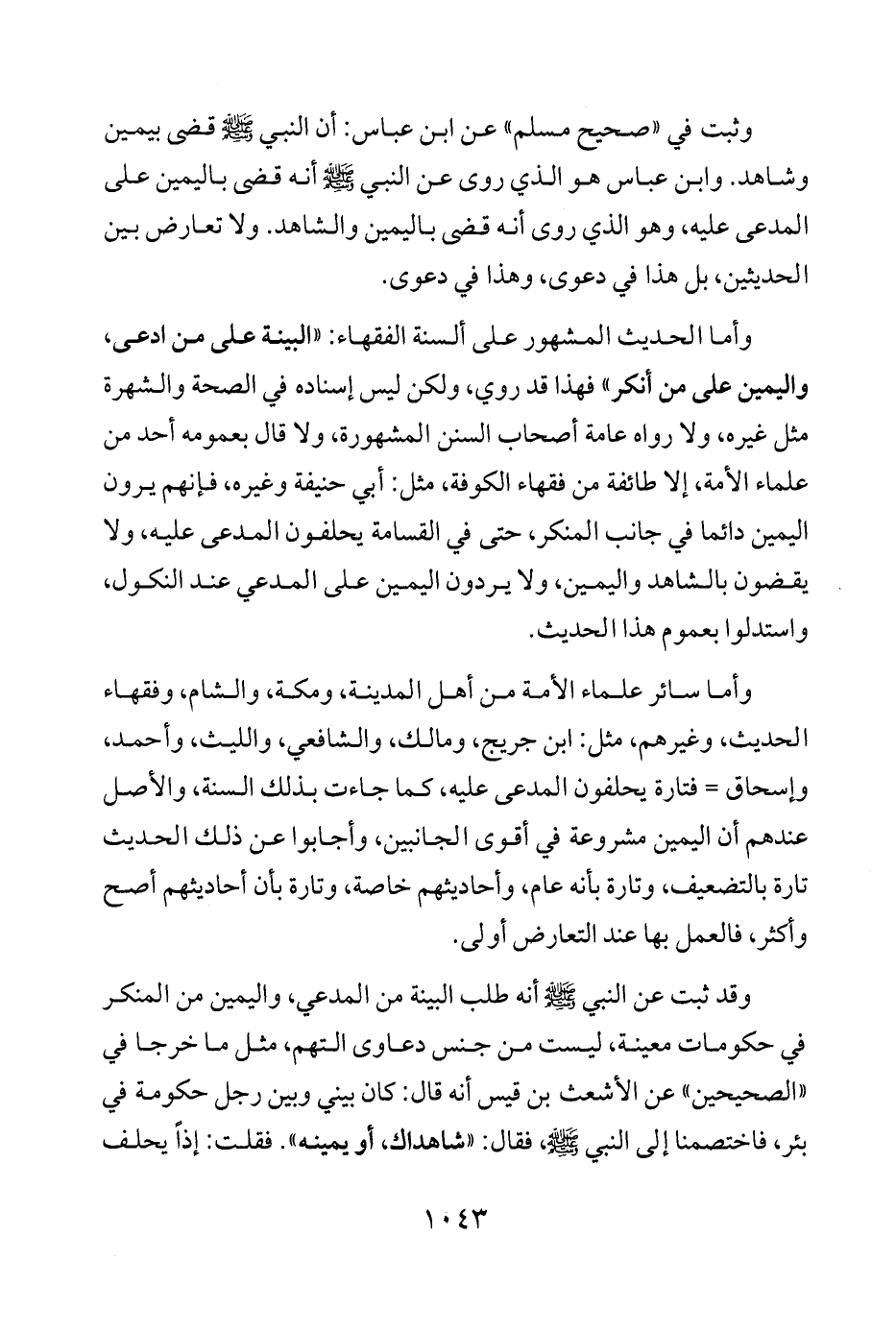 وأما سائر علماء الأمة من أهل المدينة، ومكة، والشام، وفقهاء الحديث، وغيرهم، مثل: ابن جريج، ومالك، والشافعي، والليث، وأحمد، وإسحاق = فتارة يحلفون المدعى عليه، كما جاءت بذلك السنة، والأصل عندهم أن اليمين مشروعة في أقوى الجانبين، وأجابوا عن ذلك الحديث تارة بالتضعيف، وتارة بأنه عام، وأحاديثهم خاصة، وتارة بأن أحاديثهم أصح وأكثر، فالعمل بها عند التعارض أولى.