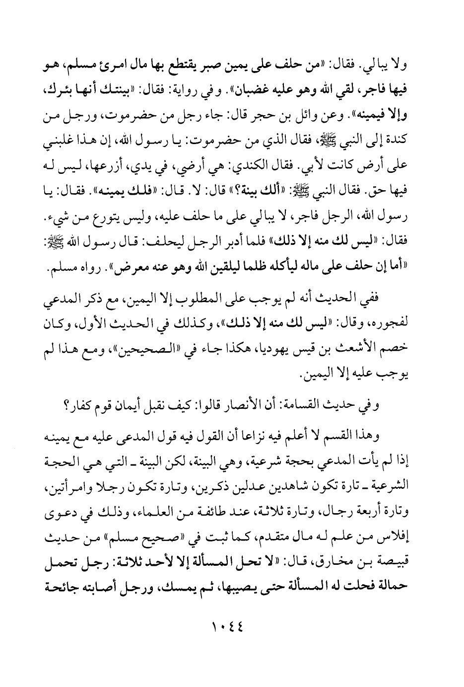 ولا يبالي. فقال. "من حلف على يمين صبر يقتطع بها مال امرئ مسلم، هو فيها فاجر، لقي الله وهو عليه غضبان". وفي رواية: فقال: "بينتك أنها بئرك، وإلا فيمينه". وعن وائل بن حجر قال: جاء رجل من حضرموت، ورجل من كندة إلى النبي - صلى الله عليه وسلم -، فقال الذي من حضرموت: يا رسول الله، إن هذا غلبني على أرض كانت لأبي. فقال الكندي: هي أرضي، في يدي، أزرعها، ليس له فيها حق. فقال النبي - صلى الله عليه وسلم -: "ألك بينة؟ " قال: لا. قال: "فلك يمينه". فقال: يا رسول الله، الرجل فاجر، لا يبالي على ما حلف عليه، وليس يتورع من شيء. فقال: "ليس لك منه إلا ذلك" فلما أدبر الرجل ليحلف: قال رسول الله - صلى الله عليه وسلم -: "أما إن حلف على ماله ليأكله ظلما ليلقين الله وهو عنه معرض". رواه مسلم.