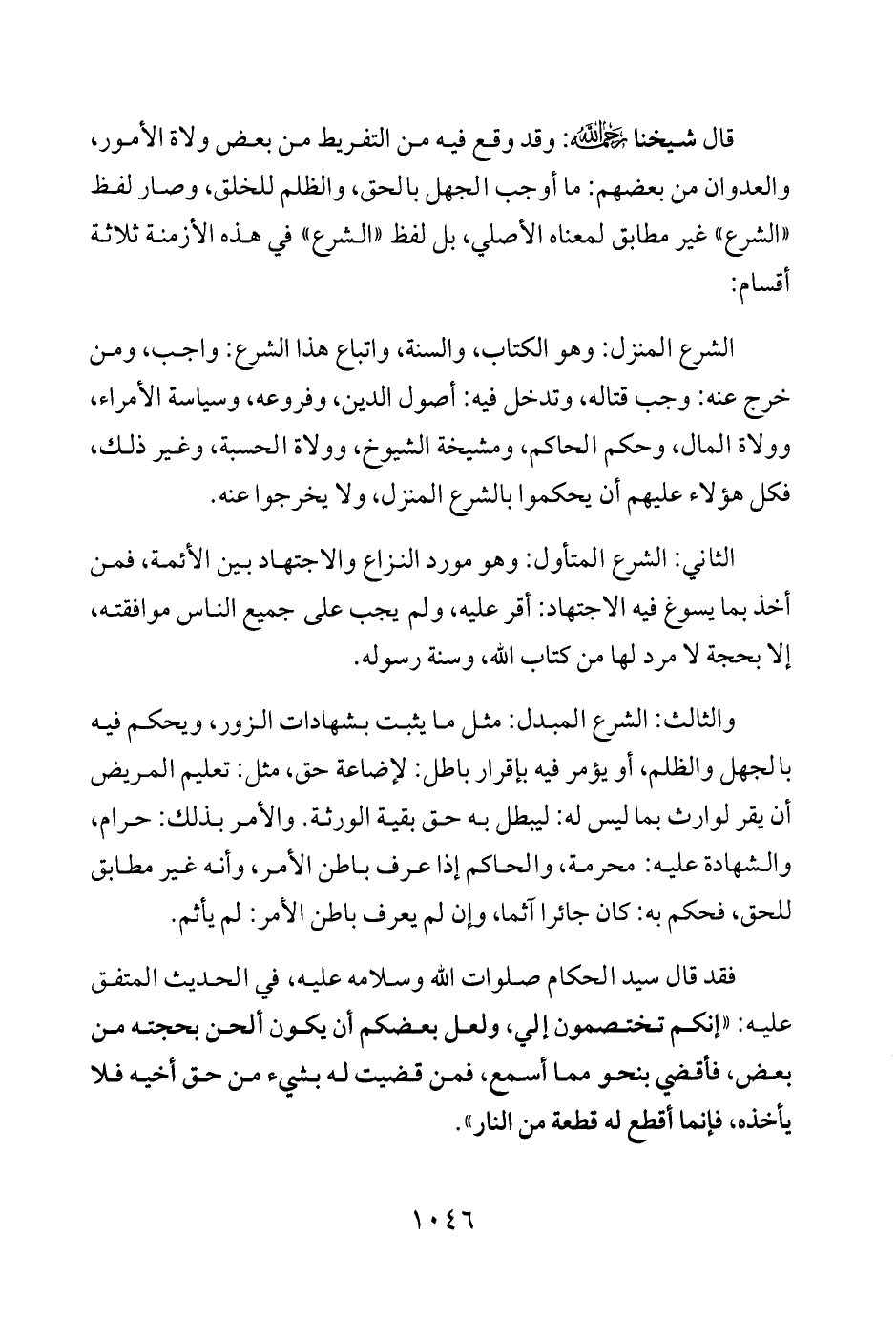 قال شيخنا رحمه الله: وقد وقع فيه من التفريط من بعض ولاة الأمور، والعدوان من بعضهم: ما أوجب الجهل بالحق، والظلم للخلق، وصار لفظ "الشرع" غير مطابق لمعناه الأصلي، بل لفظ "الشرع" في هذه الأزمنة ثلاثة أقسام: