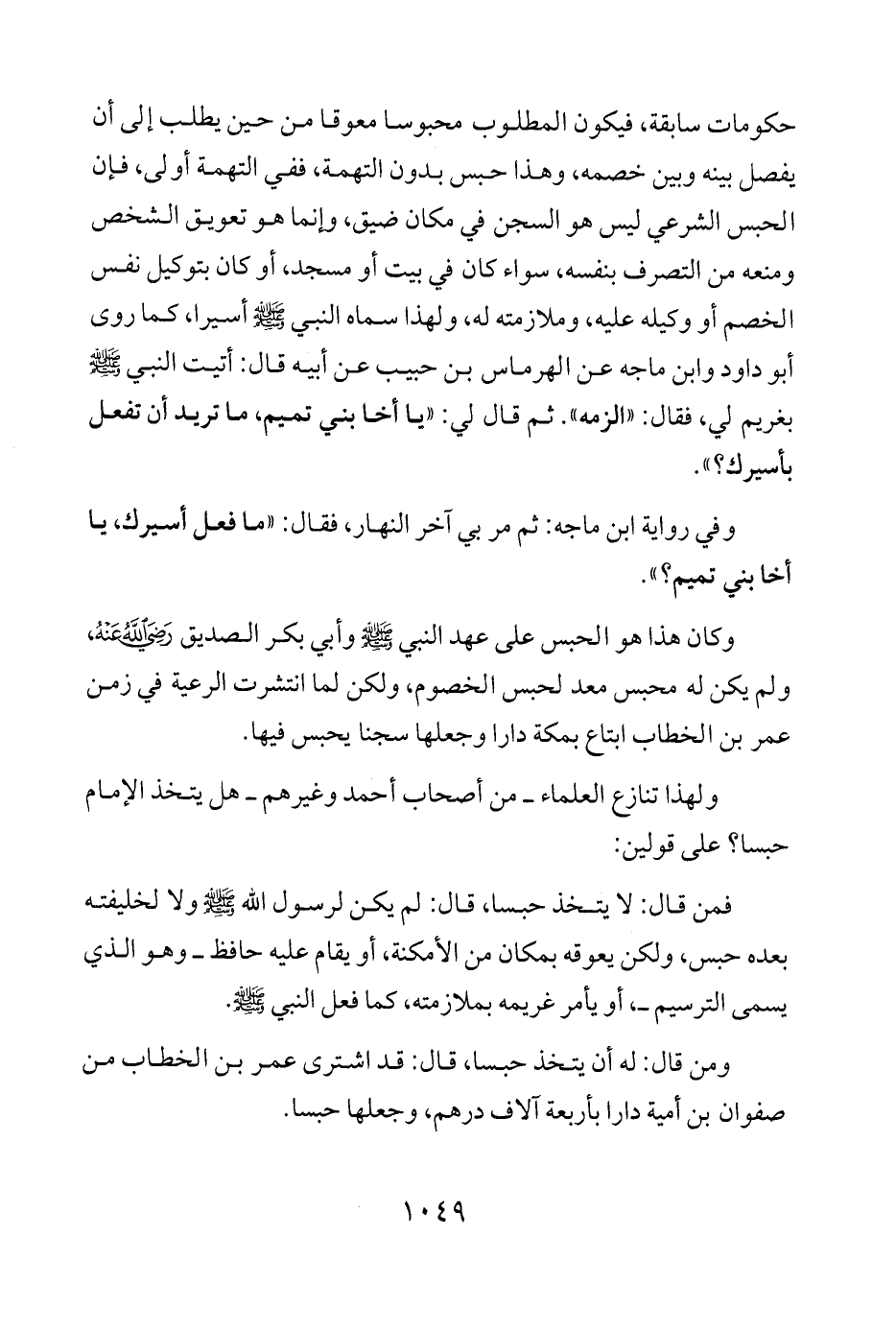 وكان هذا هو الحبس على عهد النبي - صلى الله عليه وسلم - وأبي بكر الصديق - رضي الله عنه -، ولم يكن له محبس معد لحبس الخصوم، ولكن لما انتشرت الرعية في زمن عمر بن الخطاب ابتاع بمكة دارا وجعلها سجنا يحبس فيها،