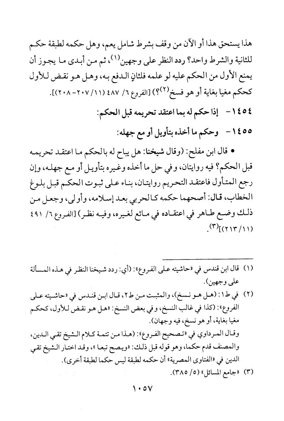 * قال ابن مفلح: (وقال شيخنا: هل يباح له بالحكم ما اعتقد تحريمه قبل الحكم؟ فيه روايتان، وفي حل ما أخذه وغيره بتأويل أو مع جهله، وإن رجع المتأول فاعتقد التحريم روايتان، بناء على ثبوت الحكم قبل بلوغ الخطاب، قال: أصحهما حكمه كالحربي بعد إسلامه، وأولى، وجعل من ذلك وضع طاهر في اعتقاده في مائع لغيره، وفيه نظر) [الفروع 6/ 491 (11/ 213)] (¬3).