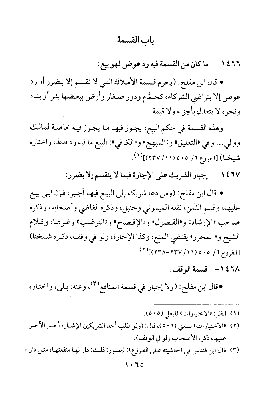 • قال ابن مفلح: (يحرم قسمة الأملاك التي لا تقسم إلا بضرر أو رد عوض إلا بتراضي الشركاء، كحمَّام ودور صغار وأرض ببعضها بئر أو بناء ونحوه لا يتعدل بأجزاء ولا قيمة.