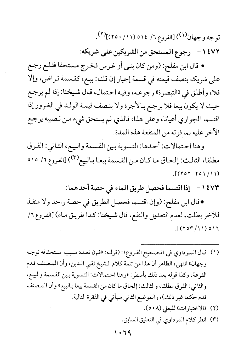 (¬1) قال المرداوي في "تصحيح الفروع": (قوله: "فإن تعدد سبب استحقاقه توجه وجهان" انتهى، الظاهر أن هذا من تتمة كلام الشيخ تقي الدين، وأن المصنف قدم الفرعة، وكذا قوله بعد ذلك بأسطر: "وهنا احتمالات: التسوية بين القسمة والبيع، والثاني: الفرق مطلقا، والثالث: إلحاق ما كان من القسمة بيعا بالبيع" وأن المصنف قدم حكما غير ذلك)، والموضع الثاني سيأتي في الفقرة التالية.