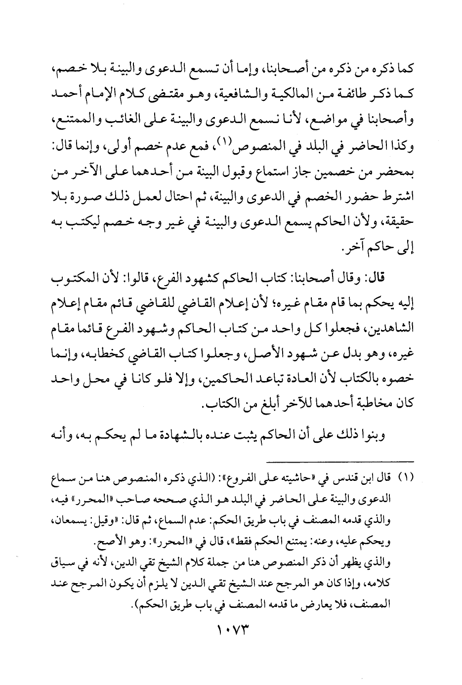 (¬1) قال ابن قندس في "حاشيته على الفروع": (الذي ذكره المنصوص هنا من سماع الدعوى والبينة على الحاضر في البلد هو الذي صححه صاحب "المحرر" فيه، والذي قدمه المصنف في باب طريق الحكم: عدم السماع، ثم قال: "وقيل: يسمعان، ويحكم عليه، وعنه: يمتنع الحكم فقط"، قال في "المحرر": وهو الأصح.