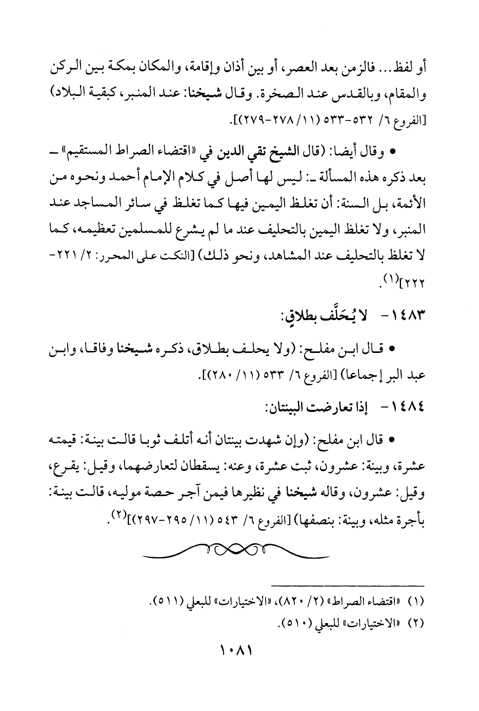 • وقال أيضًا: (قال الشيخ تقي الدين في "اقتضاء الصراط المستقيم" -بعد ذكره هذه المسألة-: ليس لها أصل في كلام الإمام أحمد ونحوه من الأئمة، بل السنة: أن تغلظ اليمين فيها كما تغلظ في سائر المساجد عند المنبر، ولا تغلظ اليمين بالتحليف عند ما لم يشرع للمسلمين تعظيمه، كما لا تغلظ بالتحليف عند المشاهد، ونحو ذلك) [النكت على المحرر: 2/ 221 - 222] (¬1).