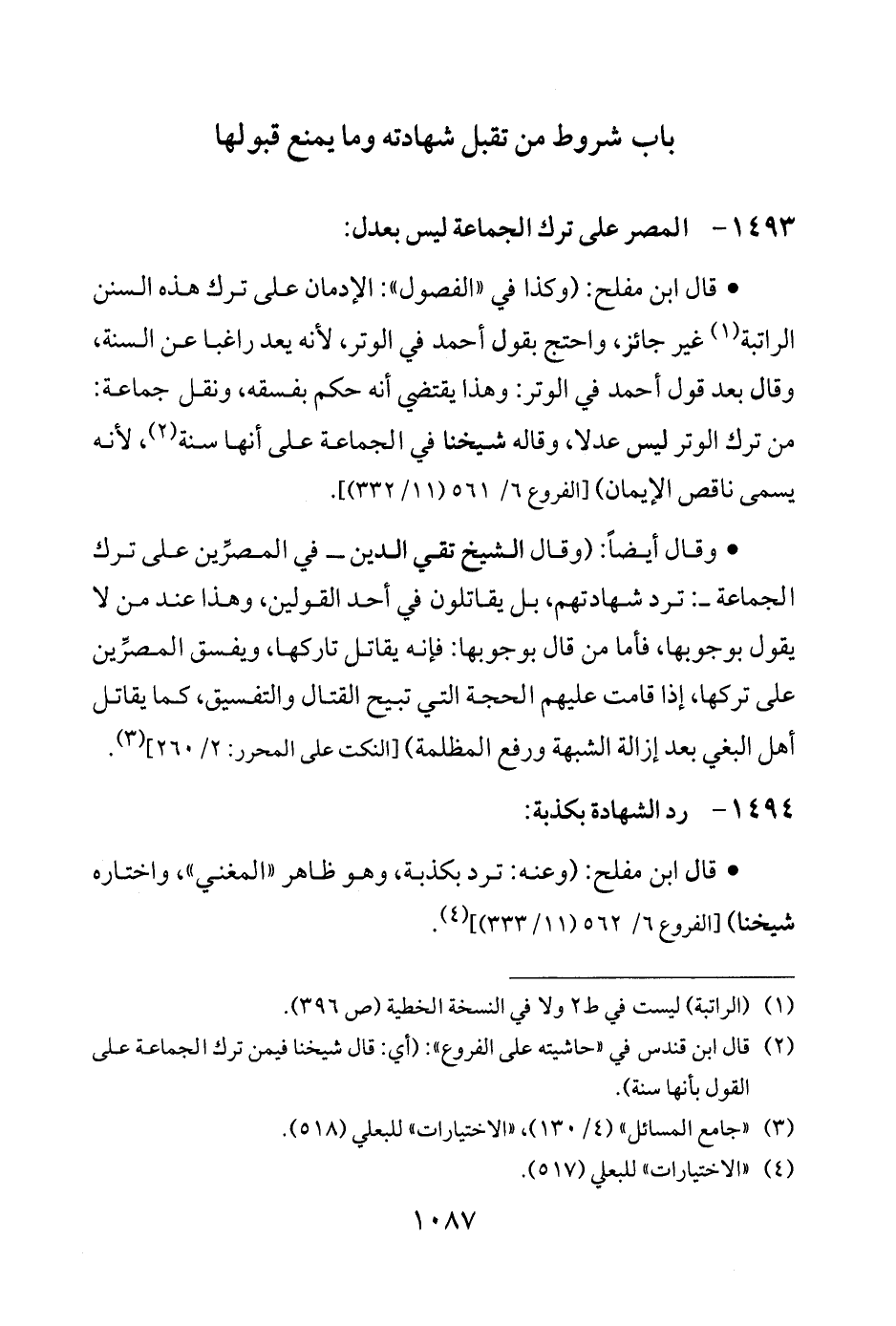 • قال ابن مفلح: (وكذا في "الفصول": الإدمان على ترك هذه السنن الراتبة (¬1) غير جائز، واحتج بقول أحمد في الوتر، لأنه يعد راغبا عن السنة، وقال بعد قول أحمد في الوتر: وهذا يقتضي أنه حكم بفسقه، ونقل جماعة: من ترك الوتر ليس عدلا، وقاله شيخنا في الجماعة على أنها سنة (¬2)، لأنه يسمى ناقص الإيمان) [الفروع 6/ 561 (11/ 332)].
