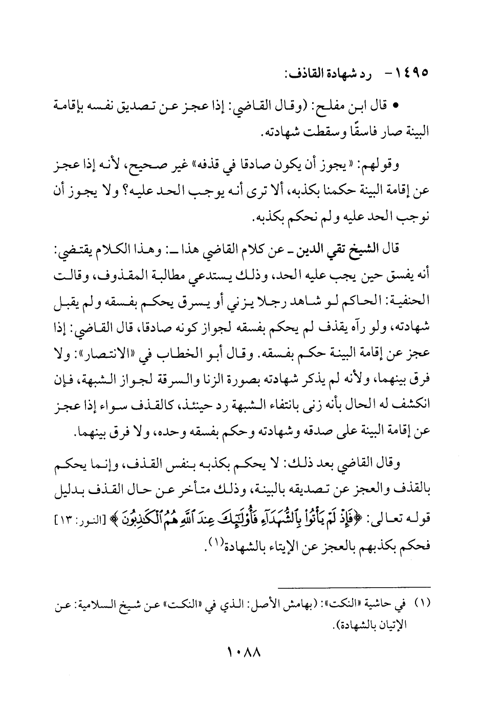 • قال ابن مفلح: (وقال القاضي: إذا عجز عن تصديق نفسه بإقامة البينة صار فاسقًا وسقطت شهادته.