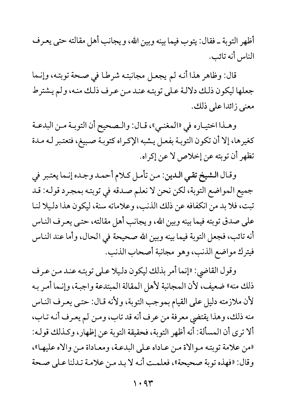 وقال الشيخ تقي الدين: من تأمل كلام أحمد وجده إنما يعتبر في جميع المواضع التوبة، لكن نحن لا نعلم صدقه في توبته بمجرد قوله: قد تبت، فلا بد من انكفافه عن ذلك الذنب، وعلاماته سنة، ليكون هذا دليلا لنا على صدق توبته فيما بينه وبين الله، ويجانب أهل مقالته، حتى يعرف الناس أنه تائب، فجعل التوبة فيما بينه وبين الله صحيحة في الحال، وأما عند الناس فيترك مواضع الذنب، وهو مجانبة أصحاب الذنب.