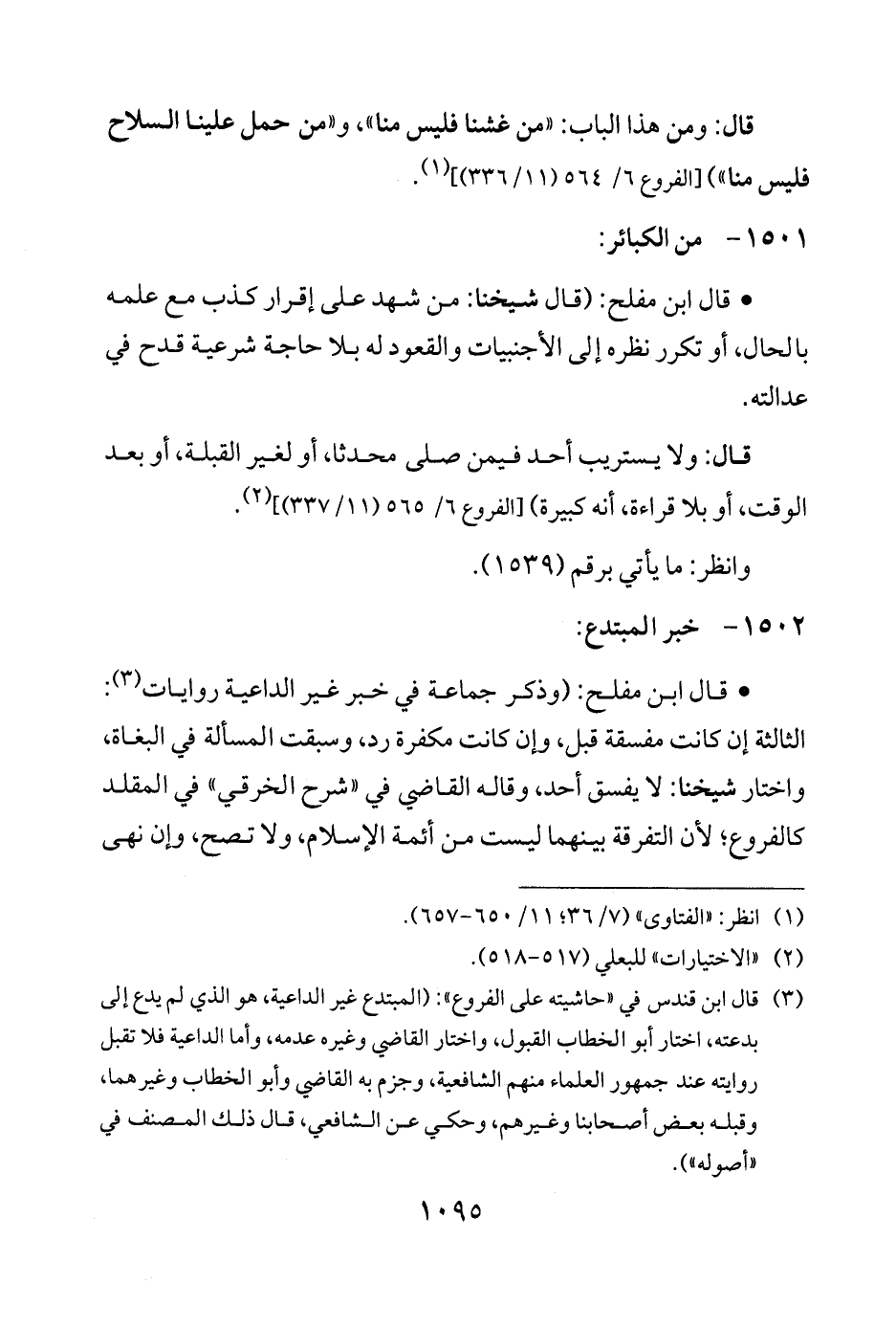 (¬3) قال ابن قندس في "حاشيته على الفروع": (المبتدع غير الداعية، هو الذي لم يدع إلى بدعته، اختار أبو الخطاب القبول، واختار القاضي وغيره عدمه، وأما الداعية فلا تقبل روايته عند جمهور العلماء منهم الشافعية، وجزم به القاضي وأبو الخطاب وغيرهما، وقبله بعض أصحابنا وغيرهم، وحكي عن الشافعي، قال ذلك المصنف في "أصوله").
