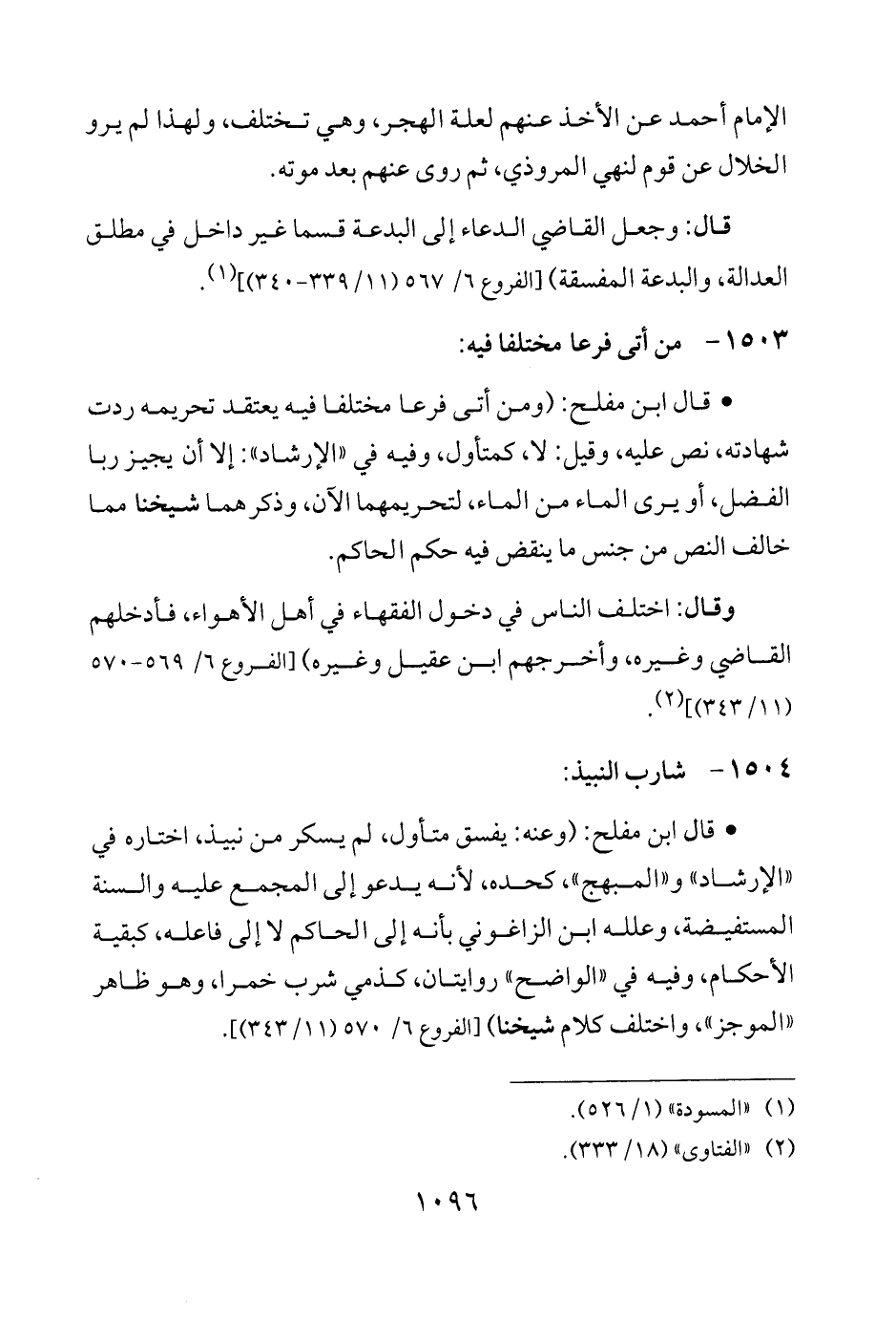 • قال ابن مفلح: (ومن أتى فرعا مختلفا فيه يعتقد تحريمه ردت شهادته، نص عليه، وقيل: لا، كمتأول، وفيه في "الإرشاد": إلا أن يجيز ربا الفضل، أو يرى الماء من الماء، لتحريمهما الآن، وذكرهما شيخنا مما خالف النص من جنس ما ينقض فيه حكم الحاكم.