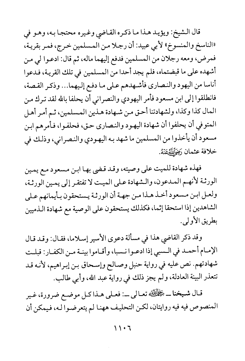قال الشيخ: ويؤيد هذا ما ذكره القاضي وغيره محتجا به، وهو في "الناسخ والمنسوخ" لأبي عبيد: أن رجلا من المسلمين خرج، فمر بقرية، فمرض، ومعه رجلان من المسلمين فدفع إليهما ماله، ثم قال: ادعوا لي من أشهده على ما قبضتماه، فلم يجد أحدا من المسلمين في تلك القرية، فدعوا أناسا من اليهود والنصارى فأشهدهم على ما دفع إليهما ... وذكر القصة، فانطلقوا إلى ابن مسعود فأمر اليهودي والنصراني أن يحلفا بالله لقد ترك من المال كذا وكذا، ولشهادتنا أحق من شهادة هذين المسلمين، ثم أمر أهل المتوفى أن يحلفوا أن شهادة اليهود والنصارى حق، فحلفوا، فأمرهم ابن مسعود أن يأخذوا من المسلمين ما شهد به اليهودي والنصراني، وذلك في خلافة عثمان - رضي الله عنه -.