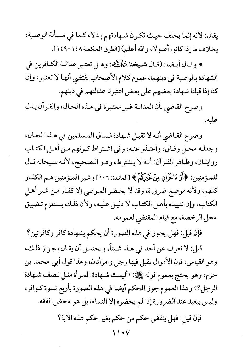 • وقال أيضًا: (قال شيخنا -رحمه الله-: وهل تعتبر عدالة الكافرين في الشهادة بالوصية في دينهما، عموم كلام الأصحاب يقتضي أنها لا تعتبر، وإن كنا إذا قبلنا شهادة بعضهم على بعض اعتبرنا عدالتهم في دينهم.