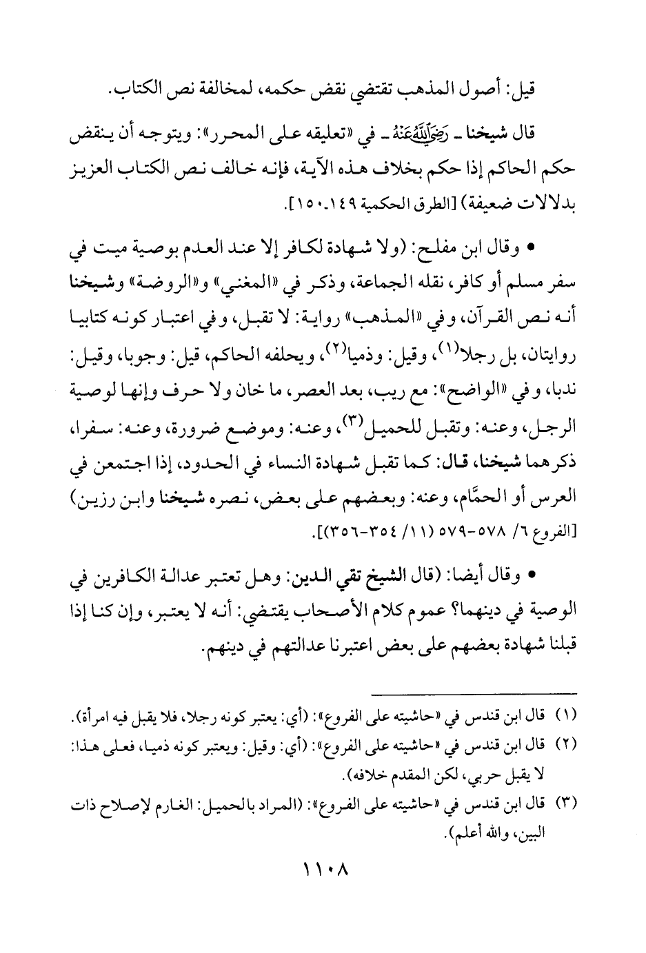• وقال أيضًا: (قال الشيخ تقي الدين: وهل تعتبر عدالة الكافرين في الوصية في دينهما؟ عموم كلام الأصحاب يقتضي: أنه لا يعتبر، وإن كنا إذا قبلنا شهادة بعضهم على بعض اعتبرنا عدالتهم في دينهم.