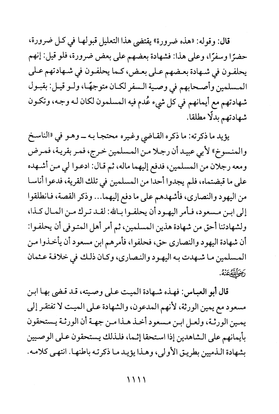 يؤيد ما ذكرته: ما ذكره القاضي وغيره محتجا به - وهو في "الناسخ والمنسوخ" لأبي عبيد أن رجلا من المسلمين خرج، فمر بقرية، فمرض ومعه رجلان من المسلمين، فدفع إليهما ماله، ثم قال: ادعوا لي من أشهده على ما قبضتماه، فلم يجدوا أحدا من المسلمين في تلك القرية، فدعوا أناسا من اليهود والنصارى، فأشهدهم على ما دفع إليهما ... وذكر القصة، فانطلقوا إلى ابن مسعود، فأمر اليهود أن يحلفوا بالله: لقد ترك من المال كذا، ولشهادتنا أحق من شهادة هذين المسلمين، ثم أمر أهل المتوفى أن يحلفوا: أن شهادة اليهود والنصارى حق، فحلفوا، فأمرهم ابن مسعود أن يأخذوا من المسلمين ما شهدت به اليهود والنصارى، وكان ذلك في خلافة عثمان - رضي الله عنه -.