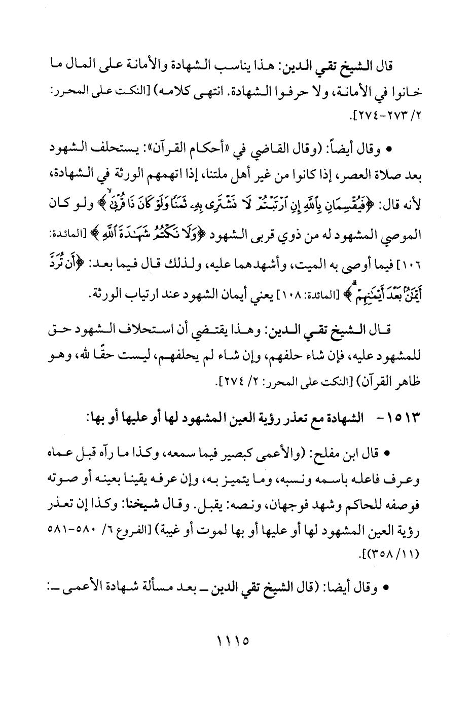 • وقال أيضًا: (قال الشيخ تقي الدين - بعد مسألة شهادة الأعمى -: