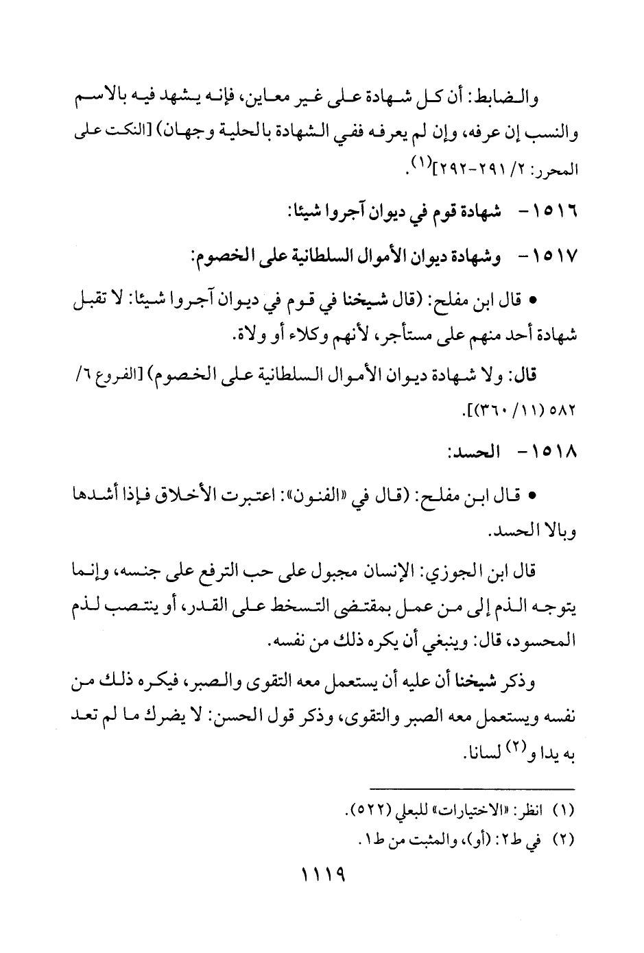 • قال ابن مفلح: (قال شيخنا في قوم في ديوان آجروا شيئًا: لا تقبل شهادة أحد منهم على مستأجر، لأنهم وكلاء أو ولاة.