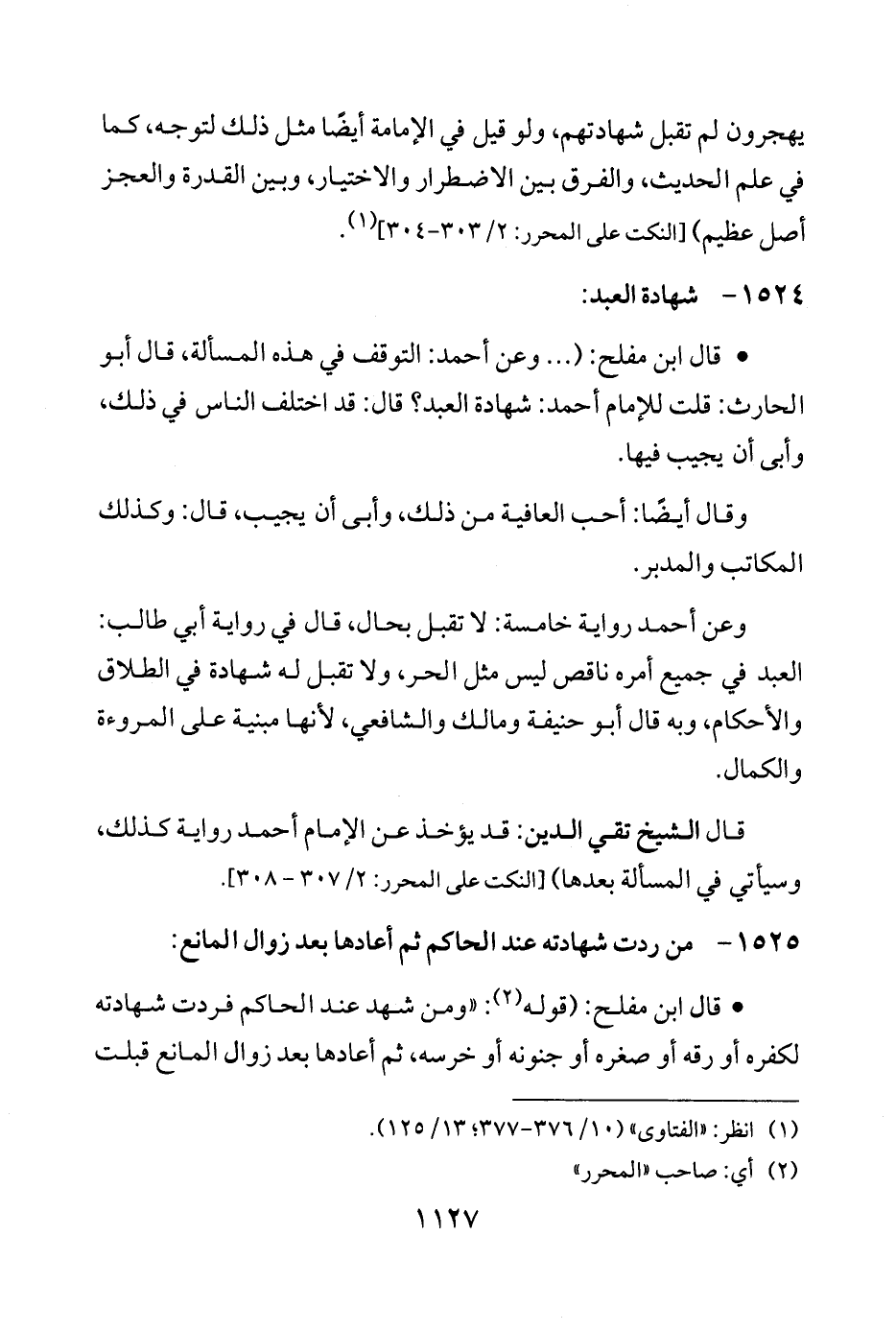 • قال ابن مفلح: ( ... وعن أحمد: التوقف في هذه المسألة، قال أبو الحارث: قلت للإمام أحمد: شهادة العبد؟ قال: قد اختلف الناس في ذلك، وأبى أن يجيب فيها.