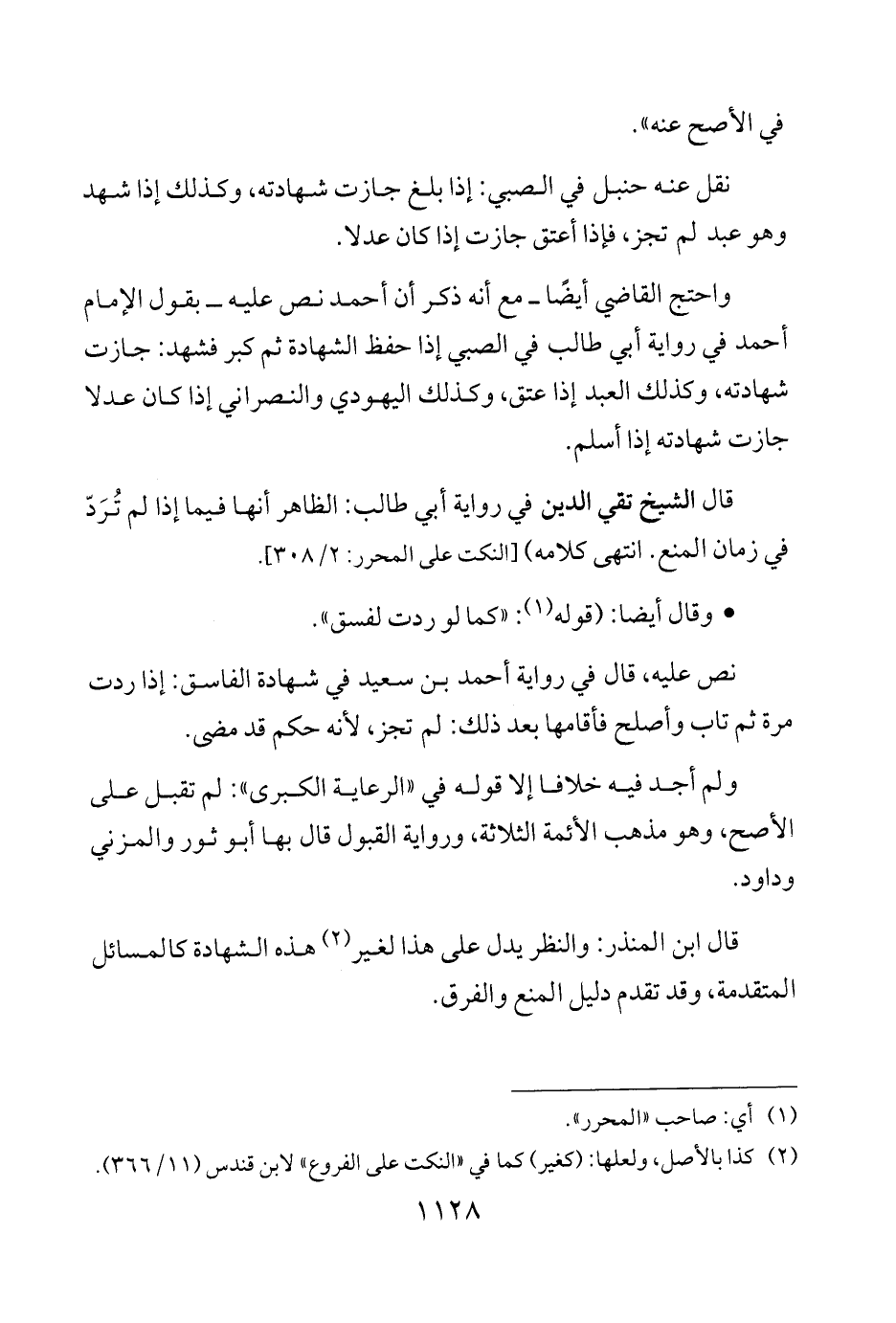 واحتج القاضي أيضًا - مع أنه ذكر أن أحمد نص عليه - بقول الإمام أحمد في رواية أبي طالب في الصبي إذا حفظ الشهادة ثم كبر فشهد: جازت شهادته، وكذلك العبد إذا عتق، وكذلك اليهودي والنصراني إذا كان عدلا جازت شهادته إذا أسلم.