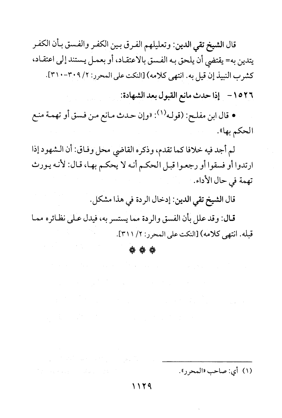 • قال ابن مفلح: (قوله (¬1): "وإن حدث مانع من فسق أو تهمة منع الحكم بها".