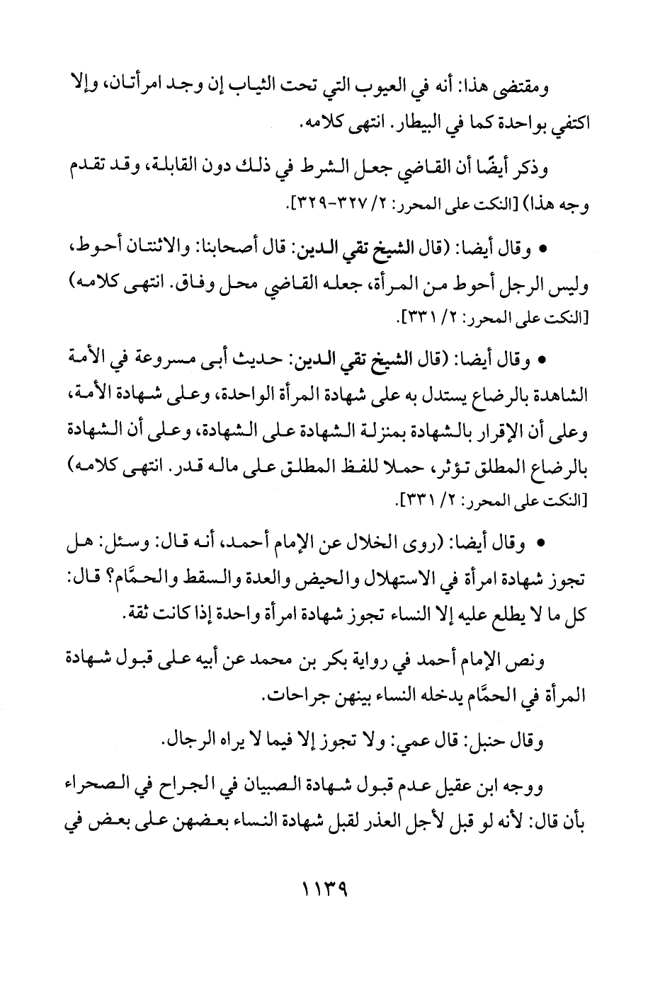 • وقال أيضًا: (روى الخلال عن الإمام أحمد، أنه قال: وسئل: هل تجوز شهادة امرأة في الاستهلال والحيض والعدة والسقط والحمَّام؟ قال: كل ما لا يطلع عليه إلا النساء تجوز شهادة امرأة واحدة إذا كانت ثقة.