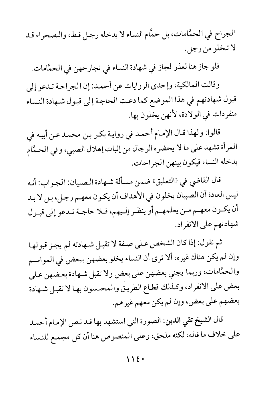 قالوا: ولهذا قال الإمام أحمد في رواية بكر بن محمد عن أبيه في المرأة تشهد على ما لا يحضره الرجال من إثبات إهلال الصبي، وفي الحمَّام يدخله النساء فيكون بينهن الجراحات.