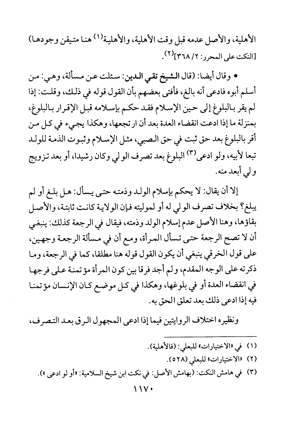• وقال أيضًا: (قال الشيخ تقي الدين: سئلت عن مسألة، وهي: من أسلم أبوه فادعى أنه بالغ، فأفتى بعضهم بأن القول قوله في ذلك، وقلت: إذا لم يقر بالبلوغ إلى حين الإسلام فقد حكم بإسلامه قبل الإقرار بالبلوغ، بمنزلة ما إذا ادعت انقضاء العدة بعد أن ارتجعها، وهكذا يجيء في كل من أقر بالبلوغ بعد حق ثبت في حق الصبي، مثل الإسلام وثبوت الذمة للولد تبعا لأبيه، ولو ادعى (¬3) البلوغ بعد تصرف الولي وكان رشيدا، أو بعد تزويج ولي أبعد منه.