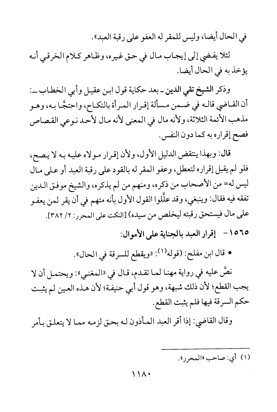 قال: وبهذا ينتقض الدليل الأول، ولأن إقرار مولاه عليه به لا يصح، فلو لم يقبل إقراره لتعطل، وعفو المقر له بالقود على رقبة العبد أو على مال ليس له = من الأصحاب من ذكره، ومنهم من لم يذكره، والشيخ موفق الدين تفقه فيه فقال: وينبغي، وقد علَّلوا القول الأول بأنه متهم في أن يقر لمن يعفو على مال فيستحق رقبته ليخلص من سيده) [النكت على المحرر: 2/ 382].