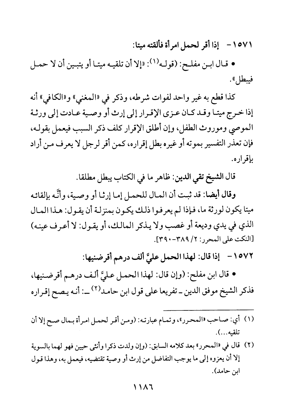* قال ابن مفلح: (وإن قال: لهذا الحمل عليَّ ألف درهم أقرضنيها، فذكر الشيخ موفق الدين -تفريعا على قول ابن حامد (¬2) -: أنه يصح إقراره