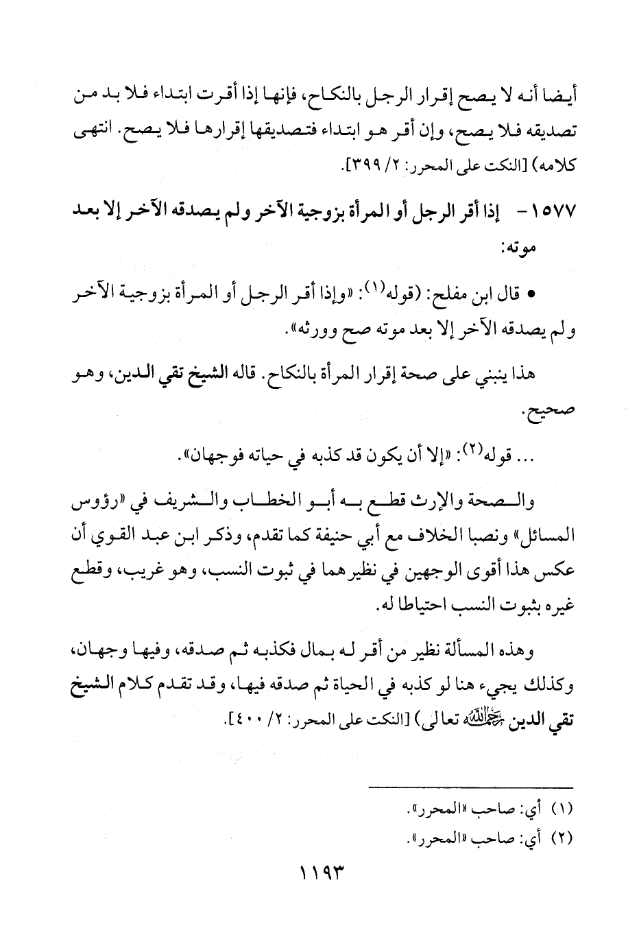 أيضًا أنه لا يصح إقرار الرجل بالنكاح، فإنها إذا أقرت ابتداء فلا بد من تصديقه فلا يصح، وإن أقر هو ابتداء فتصديقها إقرارها فلا يصح، انتهى كلامه) [النكت على المحرر: 2/ 399].