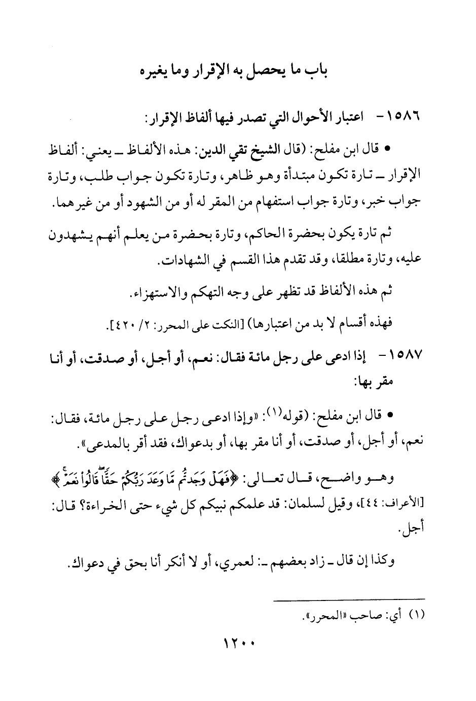 • قال ابن مفلح: (قال الشيخ تقي الدين: هذه الألفاظ -يعني: ألفاظ الإقرار- تارة تكون مبتدأة وهو ظاهر، وتارة تكون جواب طلب، وتارة جواب خبر، وتارة جواب استفهام من المقر له أو من الشهود أو من غيرهما.